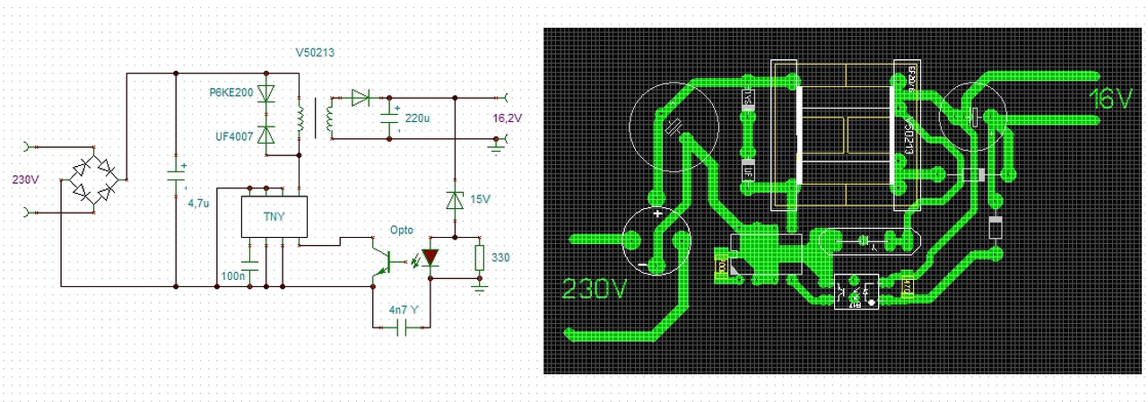 A trafó a V50213 típus ami a lomex-ben és a TME-nél is kapható 5-600Ft körüli áron. Ez EF20/6-os, tehát nagyobb teljesítményt is tud, így akár a TNY279-cel is használható, azzal már közel 20W-ot tud. A trafót a kívánt feszültség alapján érdemes kiválasztani (pl. a V50212 2x9V-os), de ettől valamennyit el lehet térni felfele és lefele is, a 15V-os trafót 10V-on is használom.