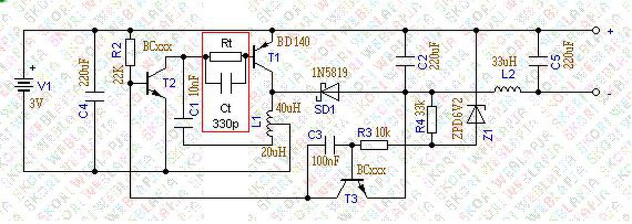 Szia! Skori kapcsolását az alábbiak szerint módosítanám, hasonlóan a tied is. Igy drasztikusan nőlhet a kijövő teljesítmény. Rt-t 47 és 220Ohm között próbálnám megtalálni. Ct nálad is 330p lehetne. A 4.7n-os kondit növelném.