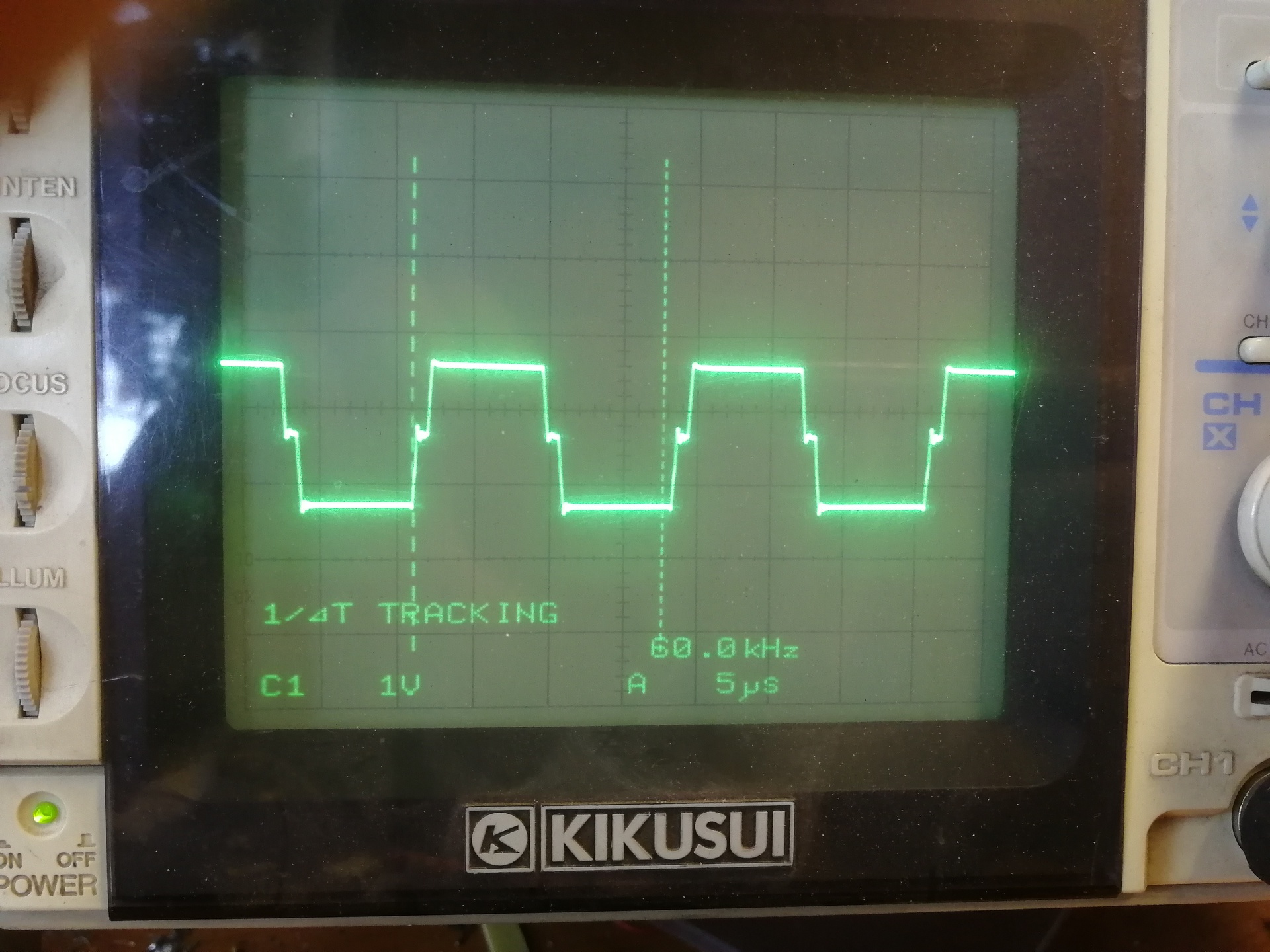 Szia! Nos, a képen eredeti pc táp trafó áttekerés nélkül olyan 60VDC a bemenet de ugyan ez a hullám alak névleges feszültségen is (~320VDC az amplitúdó nem változik csak fél tápfesszel tolódik fel fele, de ott arányaiban már nem látszik a hullámforma ilyen jól azért csak 60VDC), azért raktam bele az eredeti trafót mert már minden kipróbáltam és persze névleges feszültségen a szekunder része egyenirányítva pufferelve 1.2VDC