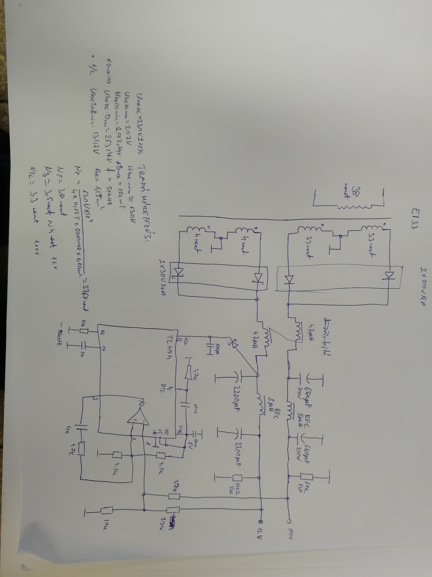 Sziasztok! ismételten szeretnék segítséget kérni a korábban említett táppal kapcsolatban. A tápnak 100V 2A illetve 12V 2A -et kellene tudnia a kimenetén. A problémám a következő ha a 100V os ágról csatolok vissza a TL494-nek és azt terhelem névleges fölé is 3.5A akkor a 100V os kimeneten teljesen jó a kimeneti feszültségem 100V ugyan úgy üresjáratban is (10k terhelő ellenállás azért van ), viszont a 12V-os ágon 17-25V között változik a feszültség a másik ág terhelésétől függően. Ellenkező esetben 12V van visszacsatolva 12 V teljesen stabil viszont üresen a (100V) 123volt lesz leterhelve meg kb 40V. Viszont ha mind 2 ágat visszacsatolom akkor totál (meghülyül) a táp és elkezdenek forrni a kapcsolótranzisztorok is. Rajzoltam egy skiccet ami a szekunder kör egy részét illetve a trafó számolásomat tartalmazza, kérlek lessetek már rá, hogy mit rontok el . Szeretném ha üres járásban is a kimeneti feszültségek is névleges közelben maradjanak. Köszönöm szépen
