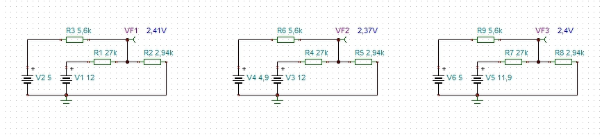 Az első eset amikor minden oké, a másodikban az 5V-ot csökkentettem 0,1V-tal, a harmadikban pedig a 12V-ot. Szépen látszik, hogy melyik mekkora változást okoz a pwm szabályozó bemenetén (a feszültségforrások jelentik a kimeneteket, a VF pontok pedig az IC bemenetét).