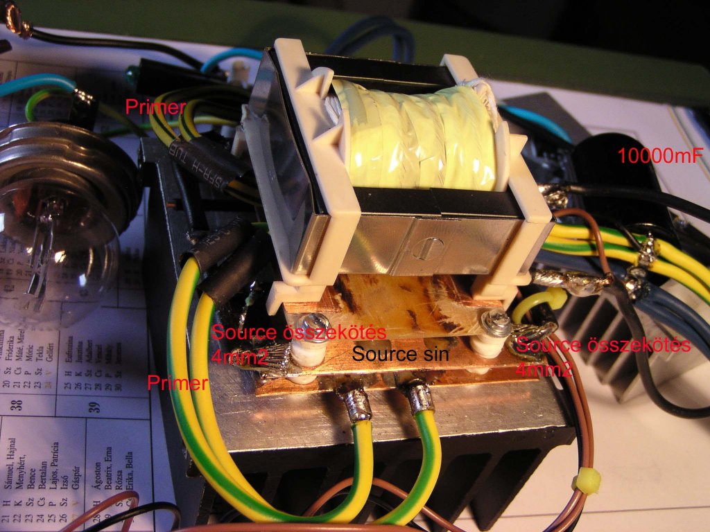 Ami nem nagyon látszik a képeken: A source sinek össz vannak kötve a négy végüknél, és az összekötések közepén csatlakozik rá a 2 bejövő 2,5mm2 GND. A 10000mF lábairól viszem a 12V-ot a fetvezérlő panelre(ezen adok neki egy jó nagy pufferkonit+100n),és a SG panelra is(ezen is puffer+100n).