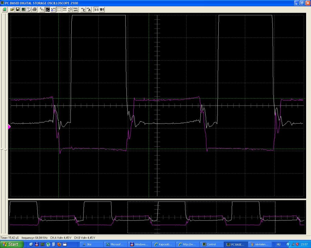 Az a lényeg, hogy ez a túllövés a szekunderen is megjelenik. Nem tudom milyen diódákat használsz, de a túllövés lehet 30-40Vos is pozitív, és még negatív irányba is. Ha a diódád nem 200V-os, akkor úgy rövidzárba megy mint a pinty. A tápod fogyaszt, de nem jön ki belőle semmi. Nem véletlenül mondtam neked, hogy ne legyen semmi a szekunderen, és a terhelésen kívül. A szekunder jelalakod hogy is van? Ott valamit össze kevertél. 2 csatornás a szkópod? vagy csak egymásra tetted a két jelalakot? A lila fázisa mintha el lenne csúszva és a polaritása is fordítva van.