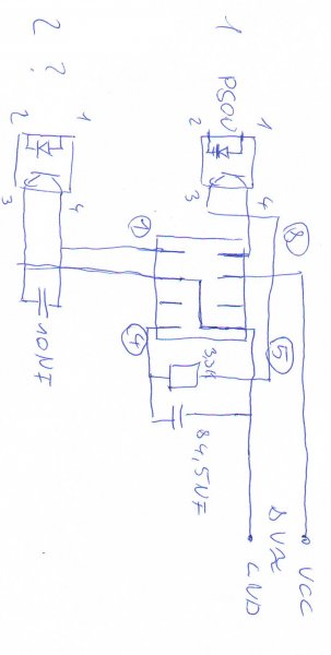 Lerajzoltam, hogy vannak bekötve a mért lábak. Az 1es opto kapcsolja be, a 2es gondolom a feszt álítja be. A müködő tápon is 8 V van ki, és bekapcsolt állapotban is. Én arra gyanakszom, hogy nincs meg az oszcillátornál a rezgés sem. Holnap még azt megnézem, hogy a jónál kikapcsolt állapotban rezeg e.