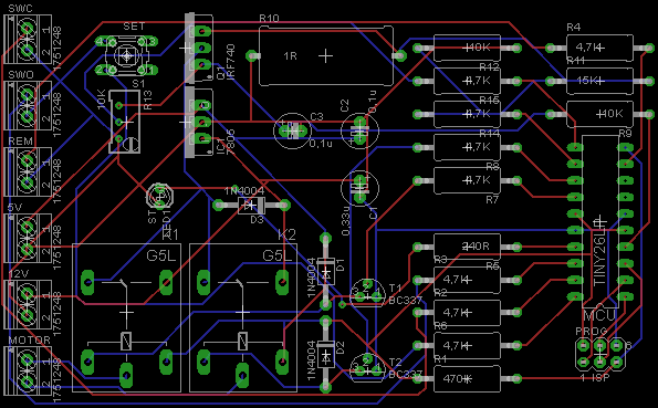 Első ránézésre nagyok az ellenállások,és nagyon vékony a huzalozás, ezt így azért ne küld el legyártatni. Főleg hogy a motor nagy áramot eszik oda kell drot. Valami leírás is jo lenne ki kivel van, és mit tud a program. Pl pwm szabályzást? És áramfigyelés az 1ohm? Nekem pl 36v os motorra kellene. Ha már ennyire benne vagy, érdemes lenne plusz relé kimenet pl nyitáskor 2-3percig meghuzna világítás kapcsolás az udvaron stb.