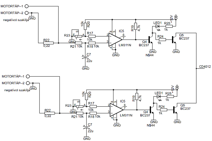 Szerintem az áramkorlát csinálja ezt, de hiába tekergetem a potmétert bármilyen állásban ugyanez a helyzet. A figyelő ellenállás az irányváltó relék előtt van a negatív ágon, tehát nem változik rajta a polaritás.