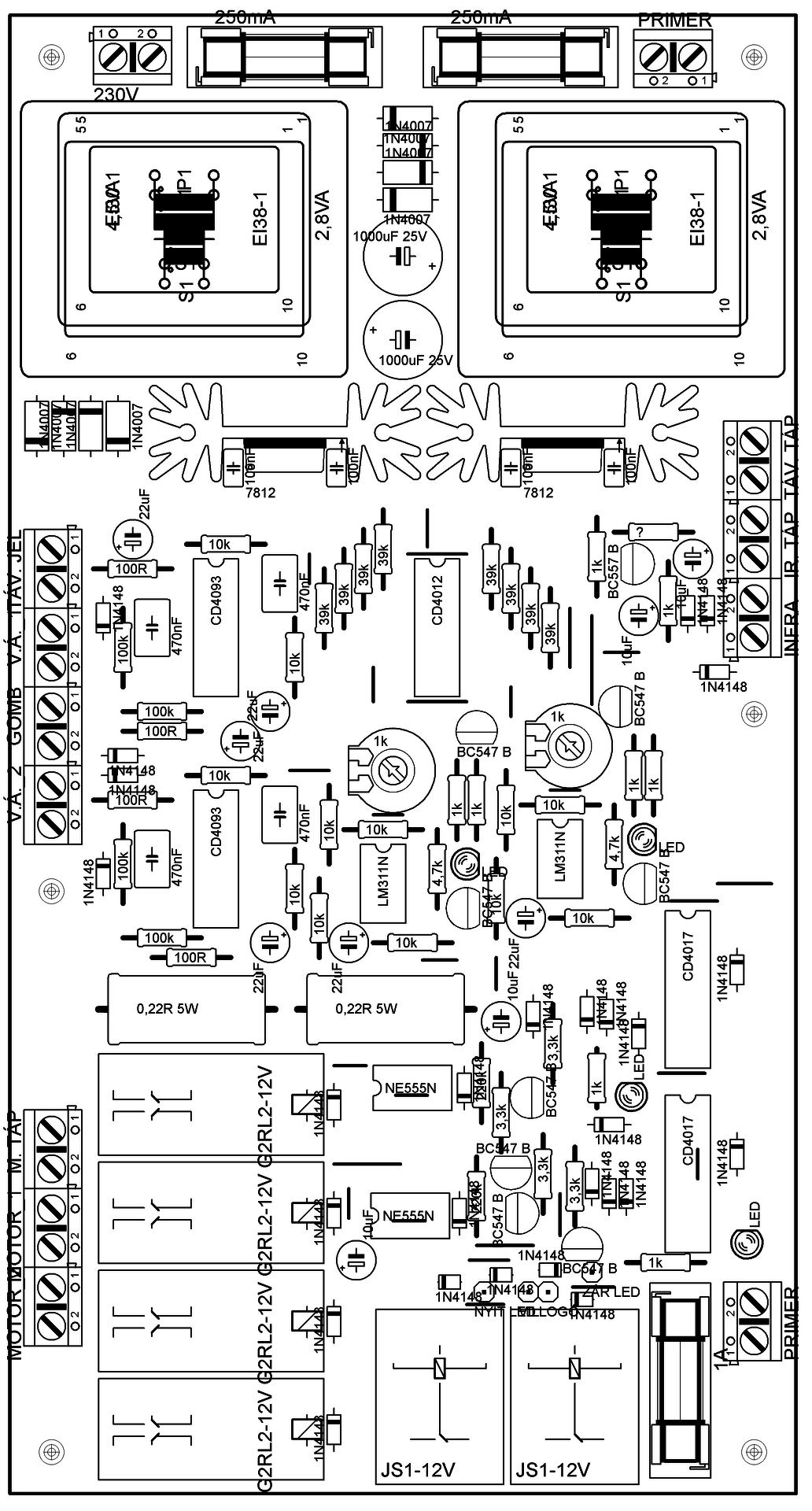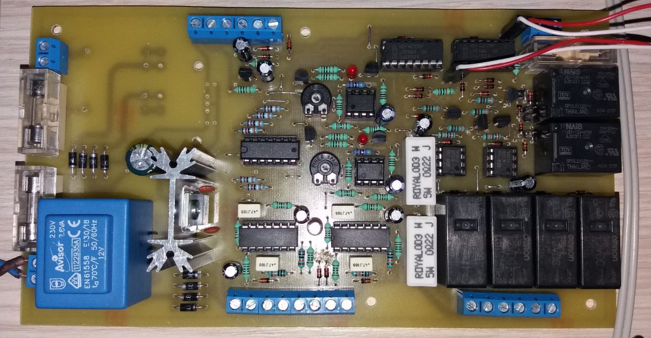 A panel nagyhoho és Tompy ötletei alapján CD4017 IC felhasználásával készültek, csak kétszárnyú kapu miatt duplán lett megépítve, a megfelelő irányokba NE555 IC-vel 3mp késleltetés, valamint készült hozzá áramfigyelő is motoronként. A tápot 2.8VA-s kis nyáktrafó szolgáltatja az áramkörnek ami stabilizálva lett, valamint van egy külön 20V 6A toroid trafó+graetz híd+4700µF pufferkondi a motorok áramellátására, amely csak a kapu mozgásakor kap áramot, készenlétnél ez le van kapcsolva, így az áramfogyasztás minimális.