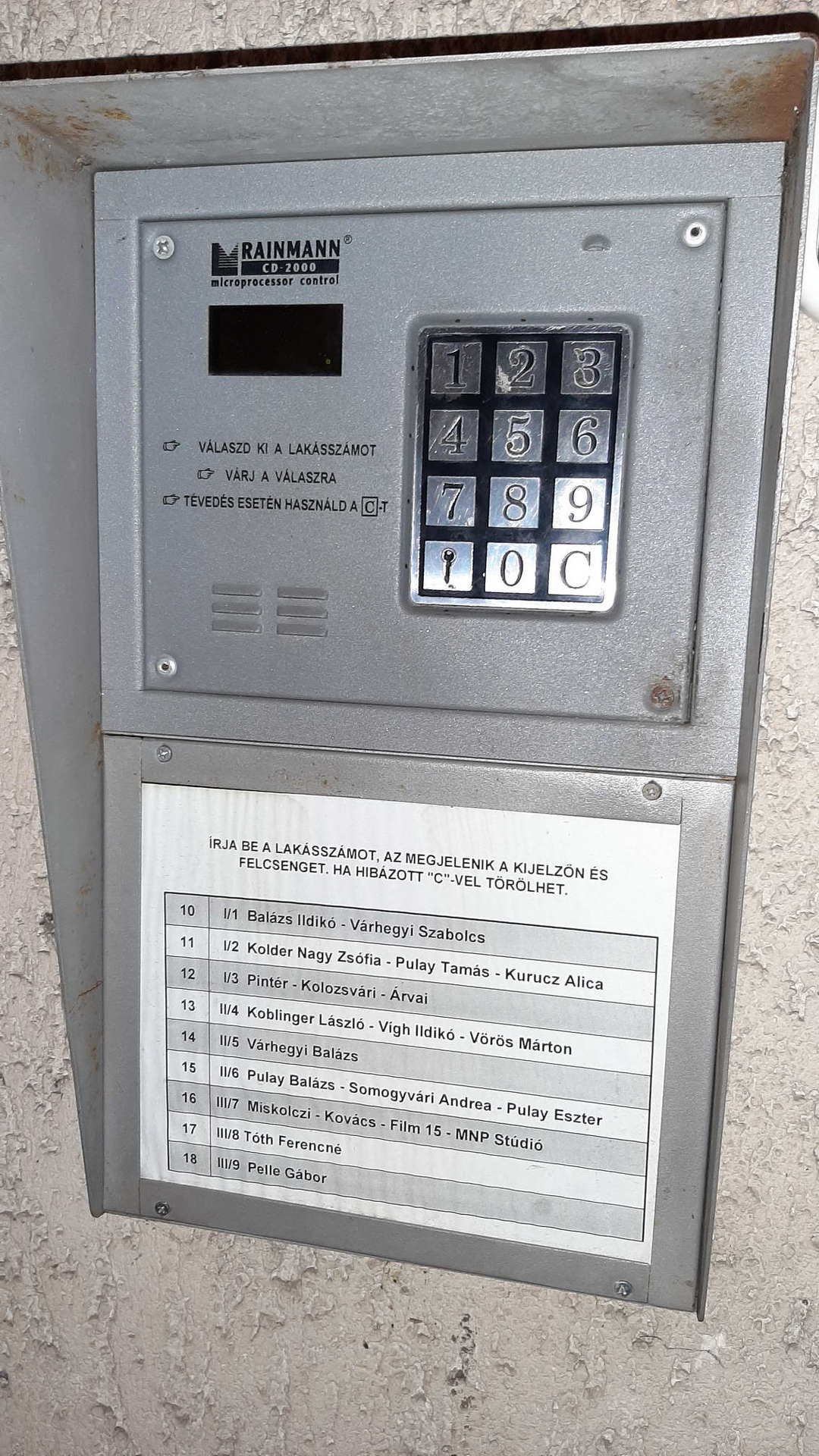 Egyszerű telefonkagyló a beszélője és a hallgató (hangszóró) is ebben van. A fali tartójában két nyomógomb van, egyik a bejárati ajtót nyitja, a másik a világítást kapcsolja föl a lépcsőházban. A központi egysége kódos nyomógombos, a bejárati ajtó nyitható kóddal és kulccsal is. Valaki maszek gyártotta, az elődje jobb volt, csak kicserélték mert a bejárati ajtó is új-mágneszáras és kódos lett, azóta csipog.