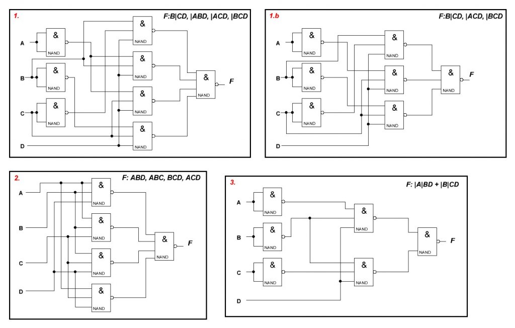 Az elsőre két változatot rajzoltam. Jó gondolom, hogy az 1.b nem hazárdmentes? A 3. feladatnál előírás, hogy kétbemenetű NAND használható csak. Nos ezt nem bírom megoldani két bemenettel. Ha csak nem az a megoldás, hogy a |B*D bemenetet kell használni a többi elhagyható.