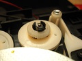 Ez lenne az. A lendkerék felől nézve a jobboldali szíjtárcsa amin azt a fehér karikát lehet meghúzni/lazítani azon a középső fekete valamin. Továbbá a kazettafészek alatt lejátszáskor egy rézlemez nekinyom egy filcet a bal orsó tengelyének.