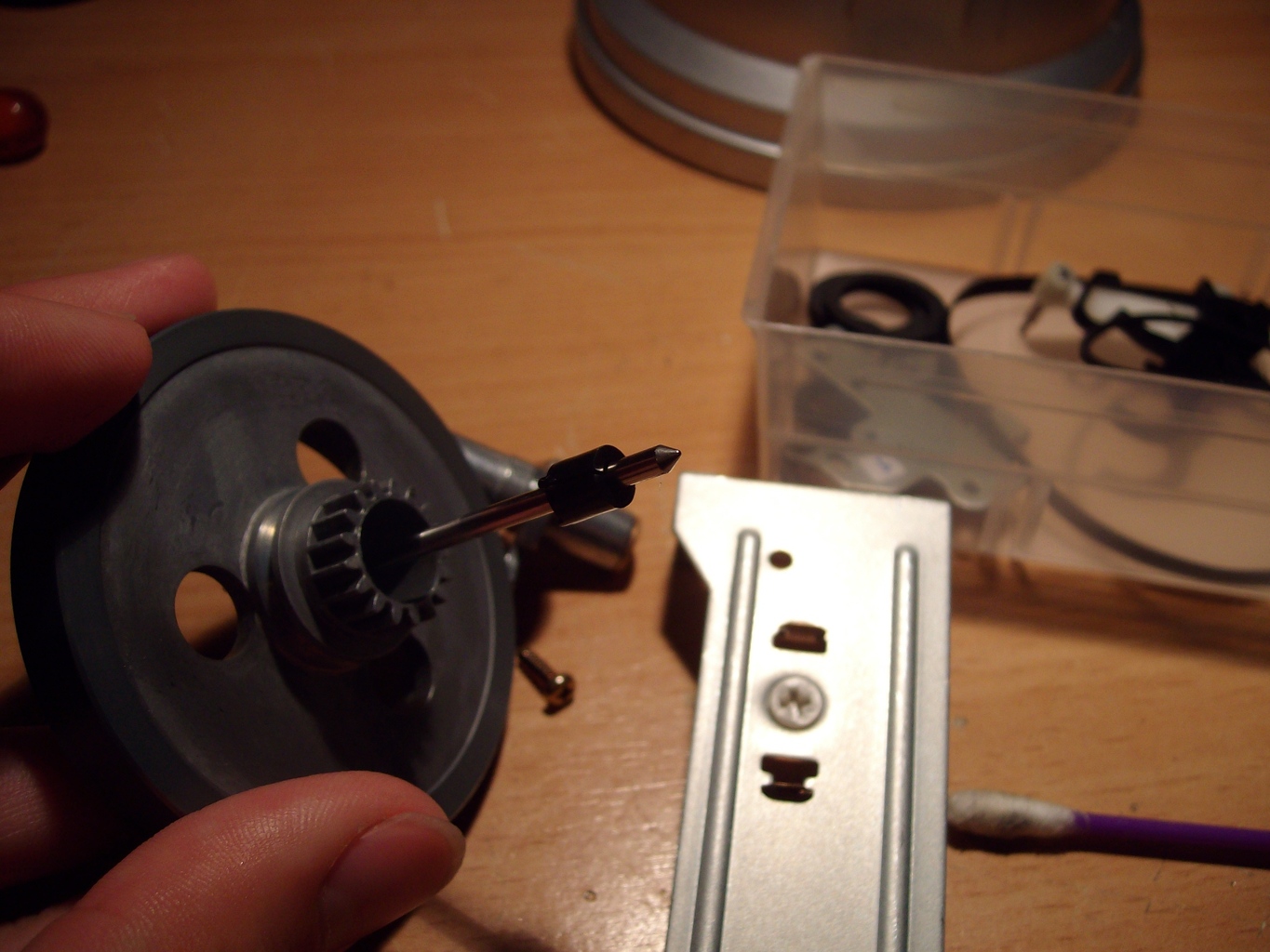 Az a lyuk valami gumis anyag, beledugtam a csavarhúzót és nem éreztem az alján semmit. Illetve ahogy mélyebbre értem, valami forgó dologhoz értem és amíg ott volt a csavarhúzóm addig nagyon lassú volt a lejátszás, ahogy kihúztam felgyorsult. Lehet nem jó szögben volt benne a csavarhúzóm?