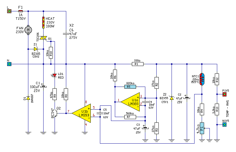 Anno én is kirajzoltam egy ilyen gyári kis keltető kapcsolását (mert hibás volt). Nagyon hasonló a megoldása, ez is a ventilátor motort használta a táp előtét ellenállása gyanánt. Egy gyári hőmérő és relatív páratartalom mérő kapcsolódott hozzá, innen táplálták azt is 1.5V-al.