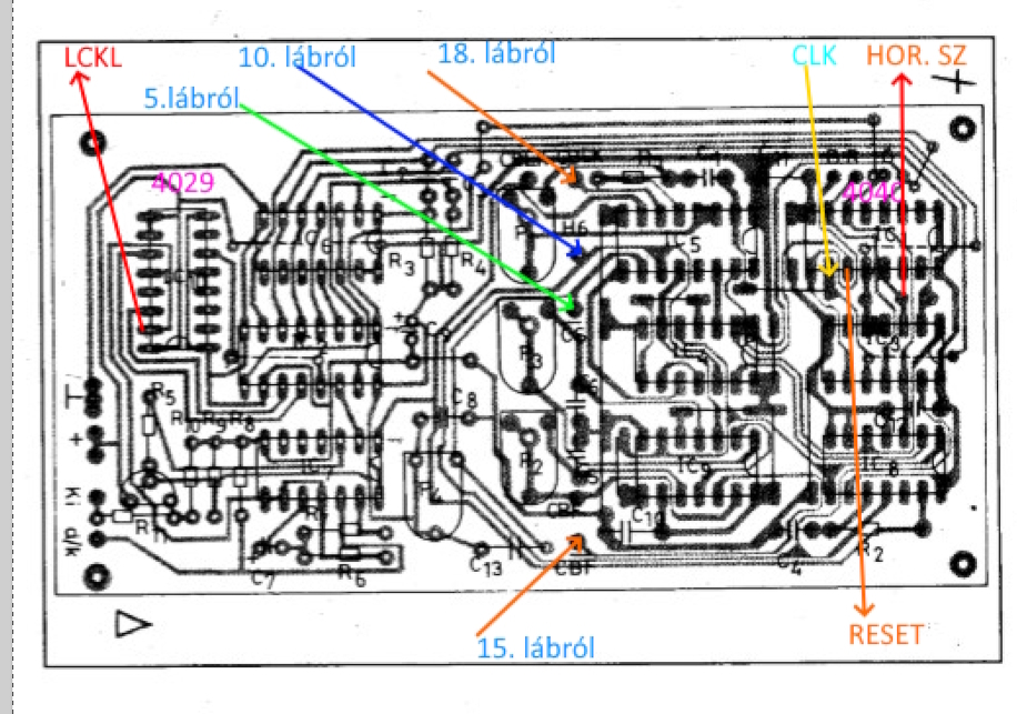 Idézet: „Szerintem az 50hz-es szinkronjelben lesz a hiba.” @kalmi.kalmi: Írtad, hogy ezt a szinkronjelet a CD4013 állítja elő. Nem nagyon akarja előállítani szerintem. @Mindenkinek szól Nagyon nehezen látható ez a PCB rajz számomra. Esetleg abban tudnátok segíteni, hogy CBF jelet, hova kell kötni? A kapcsolási rajzon csak egy pontra megy a D1 tárolóra a 13-as lábra. Igen ám! De a PCB rajzán van egy másik pont is az CBF bekötésére. A kapcsolási rajz szerint a P2 potméterre is rákerül a jel. Ilyenkor valóban a IC9 13. lábára megy a CBF jel. Ha a kép szerinti alsó pontra kötöm a CBF jelet, akkor az IC9 12. lábára megy, ha jól néztem. Miért van ez így? Végül is hova kell kötni? Összekötöttem a kettő CBF jelű pontot, meg is halt a CD4001-es IC7-es. ![]() Egy másik pont is van amit nem értek. Az IC5-re megy a CBLK jel. Ami a PCB_.jpg képen a lila 1.-es sorszámú. Ide biztosan be kell kötni a CBLK-át. Mert így jut el D1 tároló IC8 D1 tároló bemenetére. Igen ám! De hogy megy el a jel CD4030-as VAGY kapuhoz? Még ha a a képen a lila 2-es pontra is kötöm a CBLK jelet, akkor sem oda fog menni. Hogy is van ez? Itt lesz valami, csak nem tudom, hogy rontom el. Nem világos ez most. ![]() Kérlek benneteket, akinek van ideje legyen szíves nézzen rá, hogy jól kötöttem-e be jeleket. Én már számtalanszor ellenőriztem, de valamit nem veszek észre. Bekötésem. A hozzászólás módosítva: Szept 6, 2025