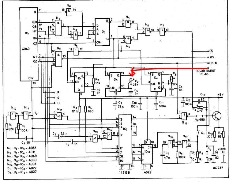 Szerintem az 50hz-es szinkronjelben lesz a hiba. A CS jel az összetett szinkronjel, kicsit bonyolult az előállítása... A D2 tároló 5-ös lábán ott kell, hogy legyen az 50Hz. Mérd meg !