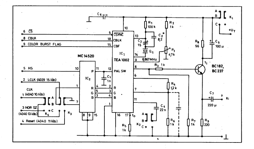 Így vannak bekötve a jelek. Az IC-ket teljesen újra cseréltem. A videójelet egy 47µF kondenzátorral kicsatoltam. Az RF modulátoron is ugyanaz a kép. Színt nem látok sehol.