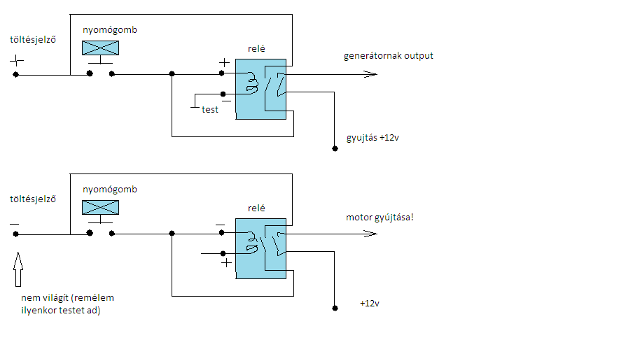A lényeg tehát, hogy a kocsink töltésellenőrzőjéről leveszem a 12 voltot, ami mindaddig világít míg a kocsi nincs beindítva és a gyujtás rá van adva közben. A folyamat a következő, nyomógombot megnyomom, a töltésellenőrző lámpa 12v-ja behuzza a relét (reteszelem is mellette), így mindaddig önindítózik a kocsi amíg be nem indul. ELMÉLETBEN. Következő dolog lenne valamiképp megoldani, hogy amikor nem kap a töltésjelzőről 12-voltot a rendszer, akkor a nyomógomb megnyomására egy késleltető segítségével a motor leálljon. lehet az indítózáshoz is kellene késleltető, hogy mondjuk ha nem indul 5 másodpercig akkor ne erőlködjön. Csináltam egy kapcsolást, de sztem ez nem az igazi, és azt feltételeztem hogy ha a töltésjelző lámpa nem világít akkor testet kap. Csatoltam a képet. Köszi a segítéget.
