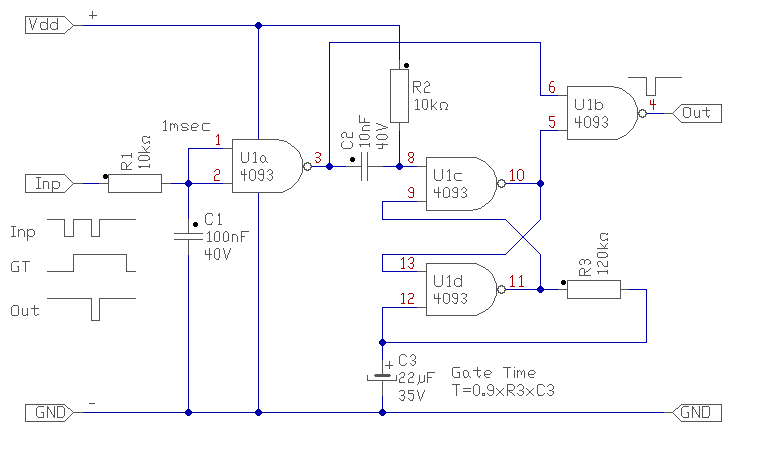 Azért megpróbálok válaszolni, mert lehet, hogy JANI nem fog, lévén, hogy a kérdés, nem az általa tervezett kapcsolásokat érinti. (és kissé csapkodsz) Elsősorban amit benézel, az, hogy nem elég korrekten mérted fel a feladatot. Pontosabban az időzítéseket, és illesztéseket. (Sajnos látom, hogy digitális áramköröket illetően még nincs gyakorlatod.) - A CMOS IC-ben van védő dióda a bemeneten, nem nagy gond, ha érinted a lábait. Leginkább nem érdemes feszültség alatt ki-be húzogatni, magasabb tápfeszt adni.. - A második kapcsolásnál is fel kell húzni a bemenetet, ha relé kontaktusról üzemelteted. (A relé kontaktus egyik fele a GND-n van, a másik a bemeneten. Legalább is mereven remélem.) - Nem tudom, hol olvasod ezt a "baromságot", hogy a nem használt kimeneteket le kell a testre kötni? A nem használt CMOS BEMENETEKET kell lekötni, pontosabban valamilyen logikai szintre kötni. (Ez lehet a GND, vagy a Vdd, de akár egy másik logikai kimenet is.) Hogy hova kell kötni, az attól függ, hogy az adott kapcsolásnál milyen logikai szükséges. Ha a kimeneteket a GND-re, vagy a Vdd-re (tápra) kötöd, akkor a kimenet zárlatba kerül, ha annak szintje ellentétessé válik, mint ahova kötve van! (pld. a CD417 esetében, "két órajel bemenet" van. Ha a számlálót felfutó élre akarjuk léptetni, akkor a léptető jelet, a 14-es lábra kötjük, és a 13-as lábat pedig GND-re kell kötni, hogy működjön (azaz beengedje a léptető jelet). Ha lefutó élre akarjuk léptetni, akkor a léptető jelet, a 13-as lábra vezetjük, de akkor a 14-es lábra logikai magas szintet adunk (azaz a Vdd-re kötjük) Bár ki is fogja elkövetni az áramkör tervezését, a működési logikája meg fog egyezni a Sebi által leírtakkal, legfeljebb a kiválasztott eszközök másak lesznek. Amennyiben a megfogalmazásod (leírásod a kért működésről) helytállóak. A belinkelt 4017-es kapcsolás nem működhet, de ennek magyarázatát bízzuk a tervezőjére. Nen érzem tisztemnek az elemzését. Ha az általam feltett rajzon az idődiagrammot (az Inp és GND közti kis ábrát) tanulmányoztad volna, akkor lehet a félreértést már kiküszöbölhettük volna. De most leírom kicsit (legalább is megpróbálom) - A vezérlést, egy relé kontaktusa végzi, ami riasztás esetén a bemenetet földre húzza. Ezzel logikai alacsony szintet létrehozva. (a nem szereplő felhúzó ellenállás segítségével) Tehát alap helyzetben a bement magas szinten van és riasztáskor kerül alacsony szintre, a riasztás idejéig. Ezt az Inp melletti ábrán láthatod, ahol egymás után két riasztási impulzust ábrázoltam. - A GT a kapu idő, amin belül kell megérkeznie a második riasztási jelnek. A GT jel, akkor indul, mikor az első riasztási jel megszűnik. (tehát a riasztási jel felfutó élére) Ha a második riasztási impulzus, a GT időn belül érkezik, akkor az kimegy az Out kimenetre. Ha nem, akkor a GT idő letelik, zárja a kimeneti kaput, és ő lesz ismét az "első" riasztási impulzus. Így a GT idő újra indul. - Az Out kimeneti jel láthatóan csak akkor jelenik meg, ha riasztási jel érkezik, a GT idő alatt. A kimeneti jel is alaphelyzetben magas szintű, és csak a második riasztás idejére lesz alacsony szintű. - Tehát a bemeneti és kimeneti jelek között, csak annyi a differencia, hogy az első elmarad. De a másodiknak a GT kapuidőn belül kell érkeznie. Ezt az időt a C3-R3 elemek határozzák meg. Ha ez az idő kicsi, akkor növelni kell valamelyik tagot a kettő közül. (A C3-nak illik tantál kondinak lenni, hogy az elkó szivárgási árama kicsi legyen.) Az R1-C1 integráló tagnak az a szerepe, hogy a bemenet ne legyen érzékeny tranziensekre, illetve a riasztó kontaktusának prellegésére (kontakthibájára). Ennek az RC tagnak az idejét a riasztási jel idejéhez igazítottan érdemes megadni. Jelenleg ez az idő, 1msec. Ha a radarok pld. 1sec ideig adnák a riasztást (kontaktus zárt állapota), akkor ezt az időt érdemes a riasztási idő 1/10-re, azaz 100msec-ra választani. (R1=100kohm C1=1uF) A kapuidőt (Gate Time), az szerint érdemes választani, hogy mennyi időn belül szeretnénk a második riasztási impulzust érzékelni "másodiknak". (Számítása az ábrán, módosítható R3 és C3 értékével.) Jelenleg ez az idő, 2,4sec-ra van állítva. Ezen időn belül kell megérezni a második riasztásnak. Ha ez az idő rövid, akkor módosítani kell az R3-C3 tagot. És most nézzük a működést: - Bekapcsoláskor az Inp bemenet magas szinten van, az U1a kapu kimenete alacsony szinten (nincs riasztás) - C3 alacsony szintre húzza U1d bemenetét, ezért az U1c és U1d-ből kialakított RS tár, alaphelyzetbe áll. 10. láb alacsony szintű és zárja a kimeneti U1b kaput. - Tekintve, hogy U1d 11. lába magas szintű, az R3-on keresztül a C3 feltöltődik (12. láb magas szintű lesz) és engedi az RS tár billentését a 8. lábról. - Amikor az első riasztási impulzus megérkezik (lefutó él), U1a kimenete magas szintű lesz. De nem történik semmi, csak a C2 kisül. (Mert R2 eleve magas szinten van, és U1a 3. lába is magas szintre kerül.) A riasztás nem tud kikerülni a kimenetre, mert az U1b kimeneti kapu az 5. láb alacsony szintje miatt még zárva van. (Nincs még GT idő) - Amikor az első riasztási impulzus megszűnik (ismét magas szintű lesz Inp a bement), U1a 3. kimenete alacsony szintre vált. Viszont a C2 kondi a 8. bemenetet egy pillanatra alacsony szintre viszi. Az RS tár bebillen, elkezdődik a GT idő, és a kimeneti kapu kinyit. (5. láb magas szintre kerül.) Most a kimeneti kapu 5. lába magas, de a 6. lába alacsony, így nincs riasztás még. - Ha GT ideje alatt újból riasztás érkezik (míg az 5. láb magas szinten van), akkor az Inp bemenet alacsony szintű lesz, U1a kimenete magas, így az U1B 6. bemenete is magas szintű és mivel az 5. is magas