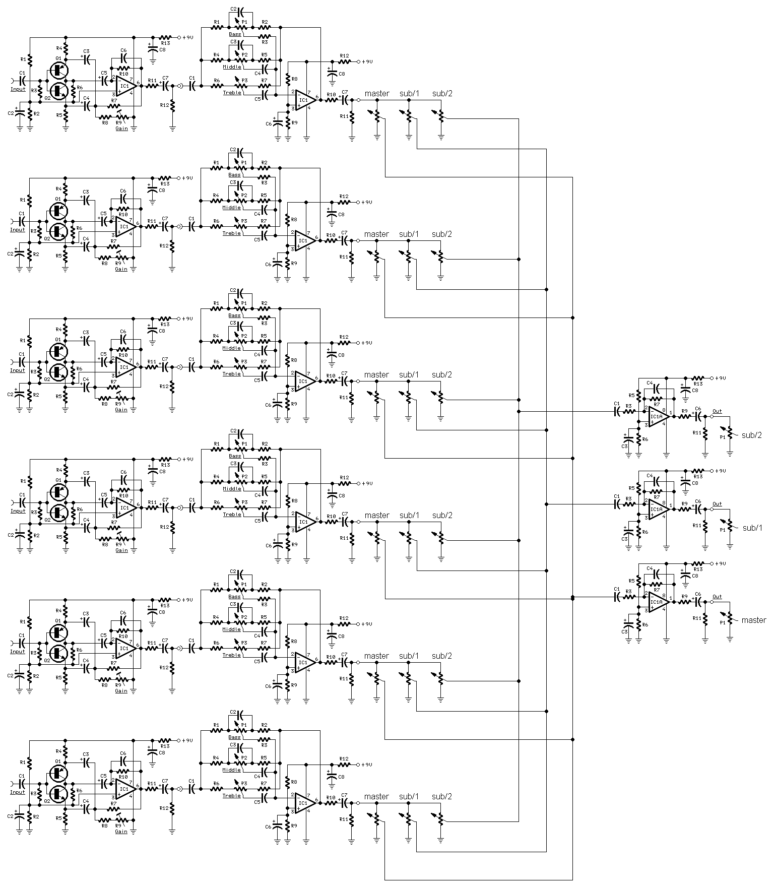 Hello tudna valaki nekem abban segiteni hogy kellene egy keverőhöz kapcsolási rajz 10 bemenet ,omdegyik kulon szabályozható gain master mély magas kozep és 3 egymástól független külön allithatop kimenet előre is köszönöm a válaszokat