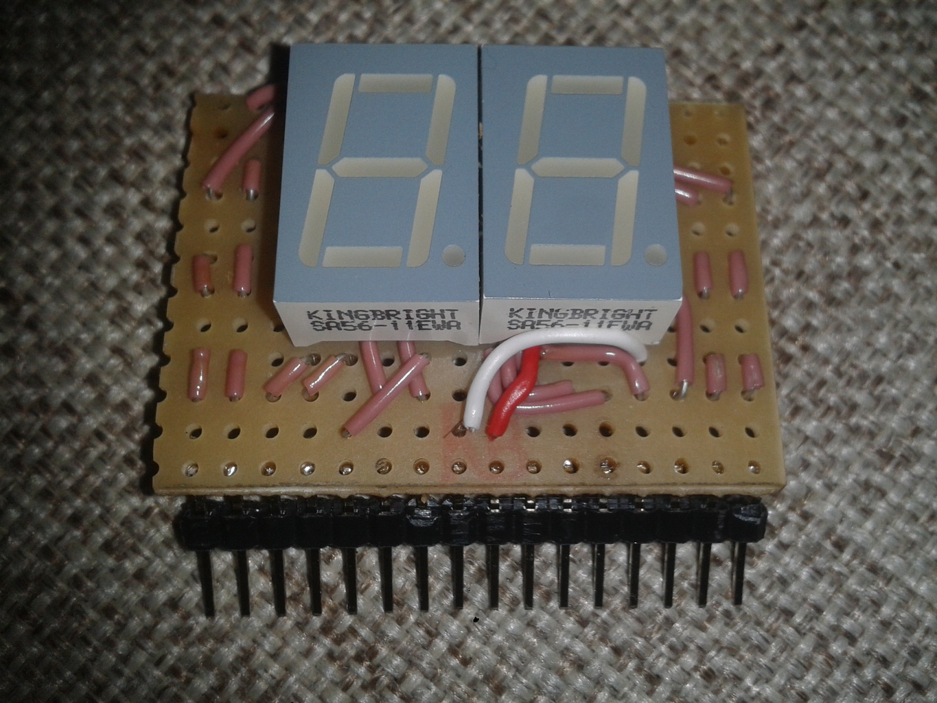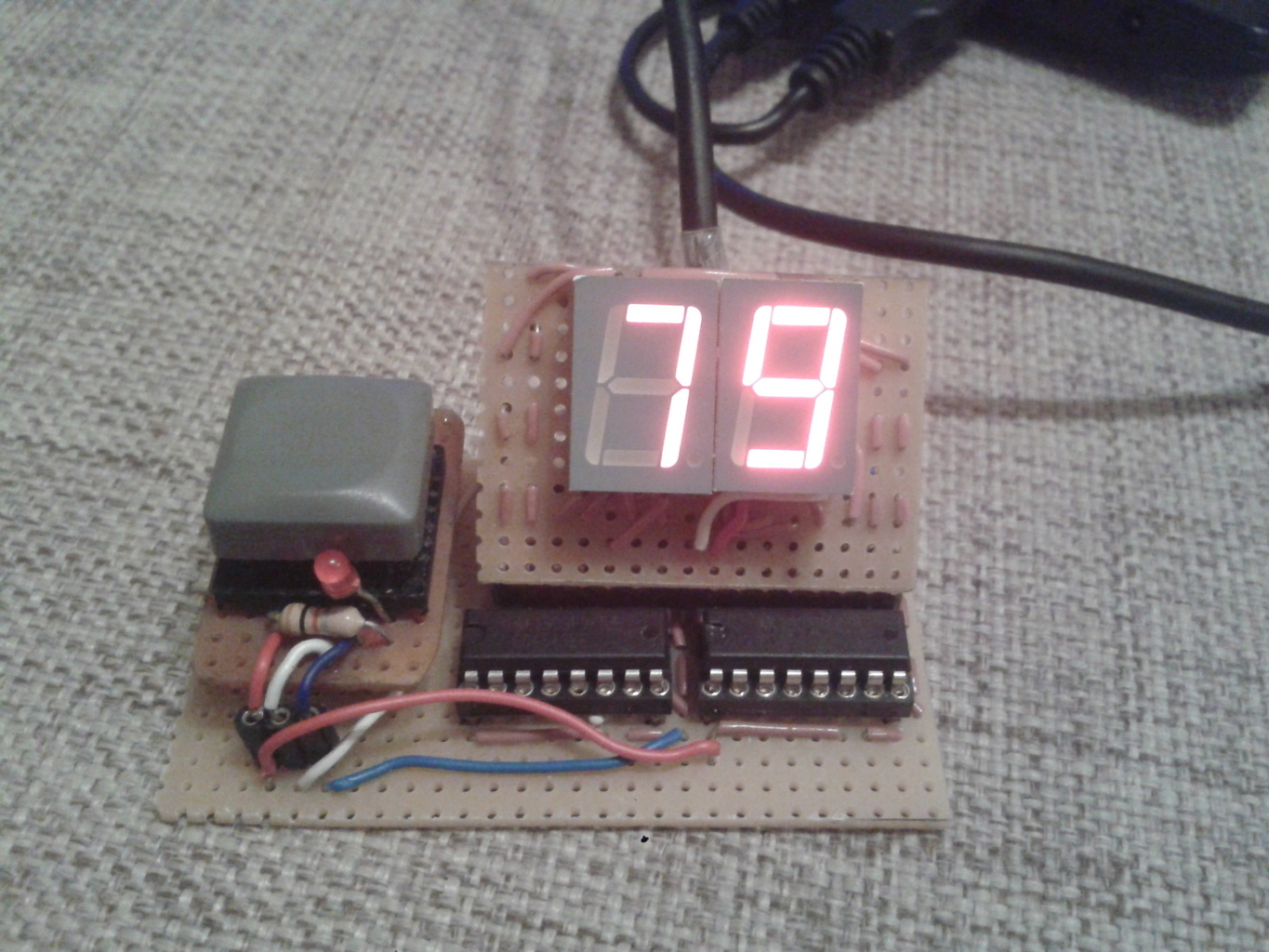Elkészült az első "komolyabb" szerkezetem, egy 0-99-ig számláló. 2 db 7 szegmenses kijelző van benne amit külön-külön egy-egy 4543 as IC hajt meg. A számlálásért 2 db 7490-es IC felelős , egy az egyes helyi értékért , egy másik pedig a tízesekért felelős.