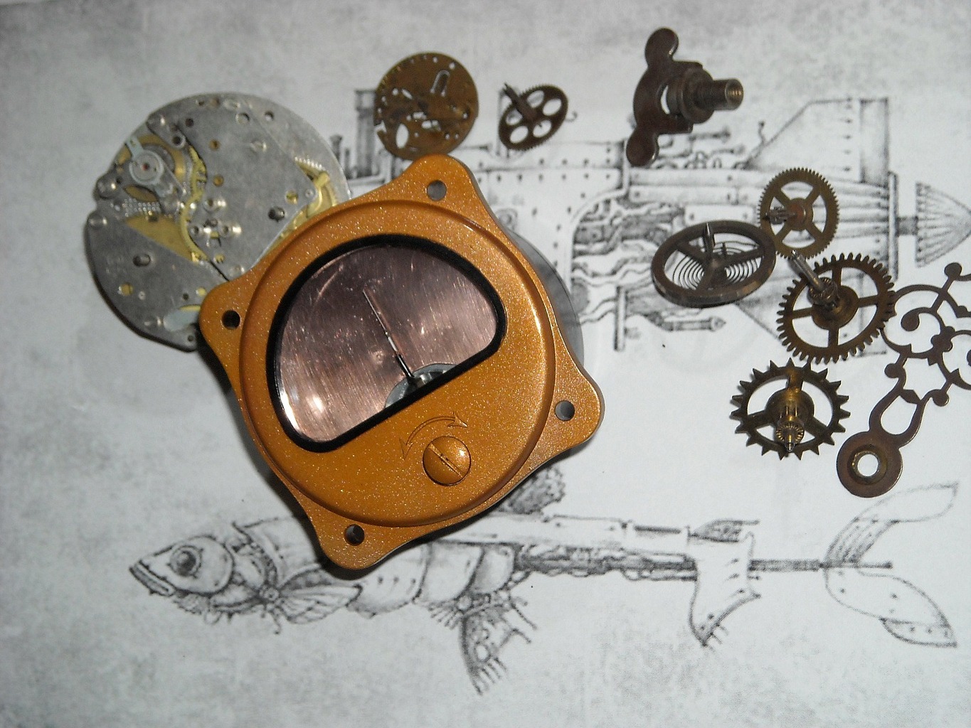 A következő projektemhez készítettem elő egy műszert. Festve lett fémes bronzszínűre az eleje (sajnos a fényképezőgép nem adja vissza). Illetve a skála lemeze lett kicserélve egy polírozott rézlemezre.