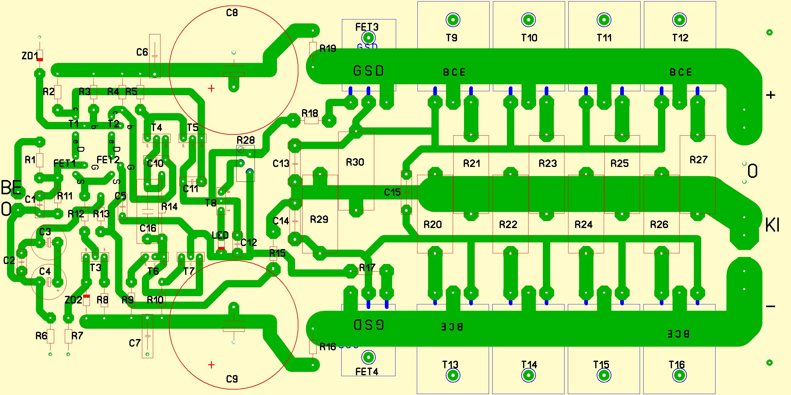 A FET-es pedig teljesen a rezós, de ha jobban megnézed az áramkört rájössz h. csak a meghajtófokozat Fet-es,a vége Full tranyós(8db/oldal)