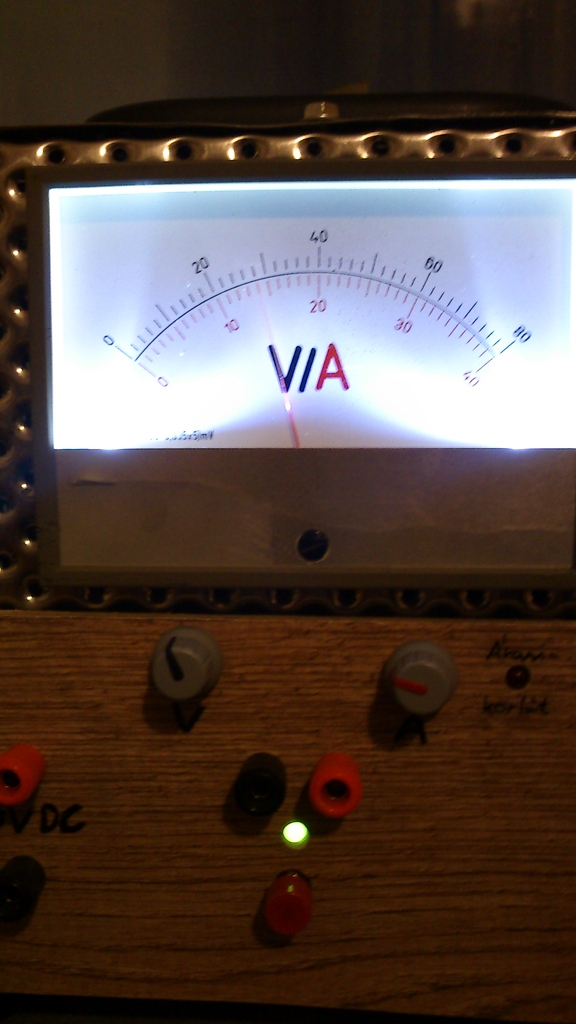 Üdv mindenkinek! Nemrégiben elkészültem saját labortápegységemmel, amelyet minimális anyagi ráfordítással, szinte teljes egészében bontott alkatrészekből vagy éppen hulladékból építettem meg. 30V-os feszültség és 4A-es áramkorlátig használható. A V és A kijelzés közt kapcsolóval lehet váltani. A V/A mérőt fejlesztettem még egy világítással is, a fotókon a róla készült első kép félhomályban, a második pedig teljes sötétben jól mutatja a skála és a mutató láthatóságát.
