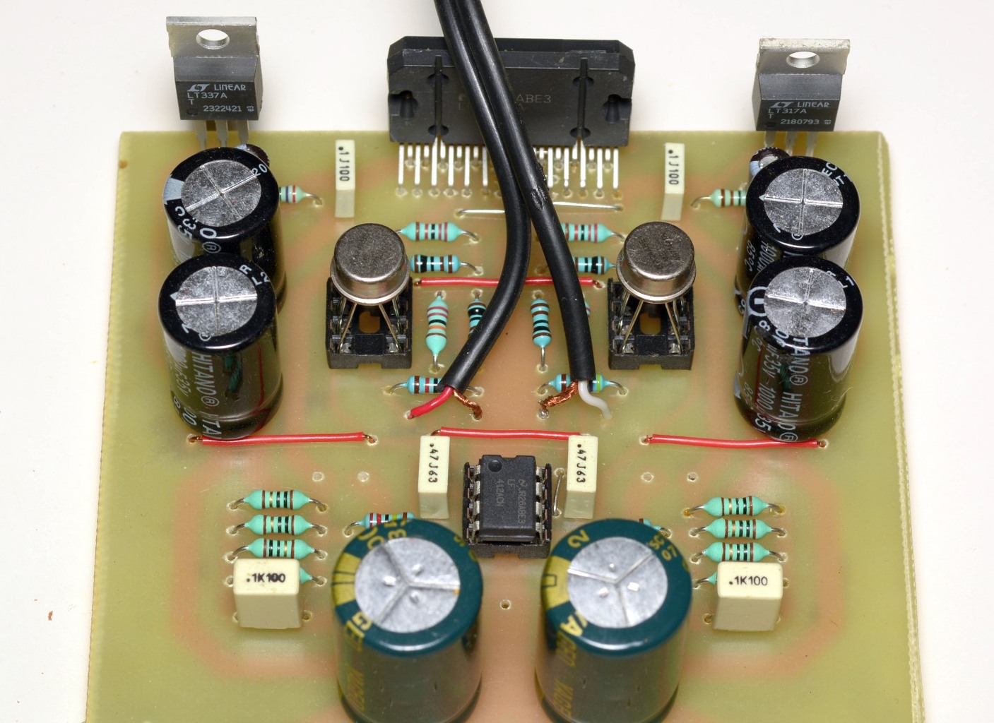 Invertáló gainclone LM4780, bemeneti buffer LME49710HA, DC servo LF412, stabil fesz a műveleti erősítőknek LT317A/337A, 8db diófa (képen nincs).