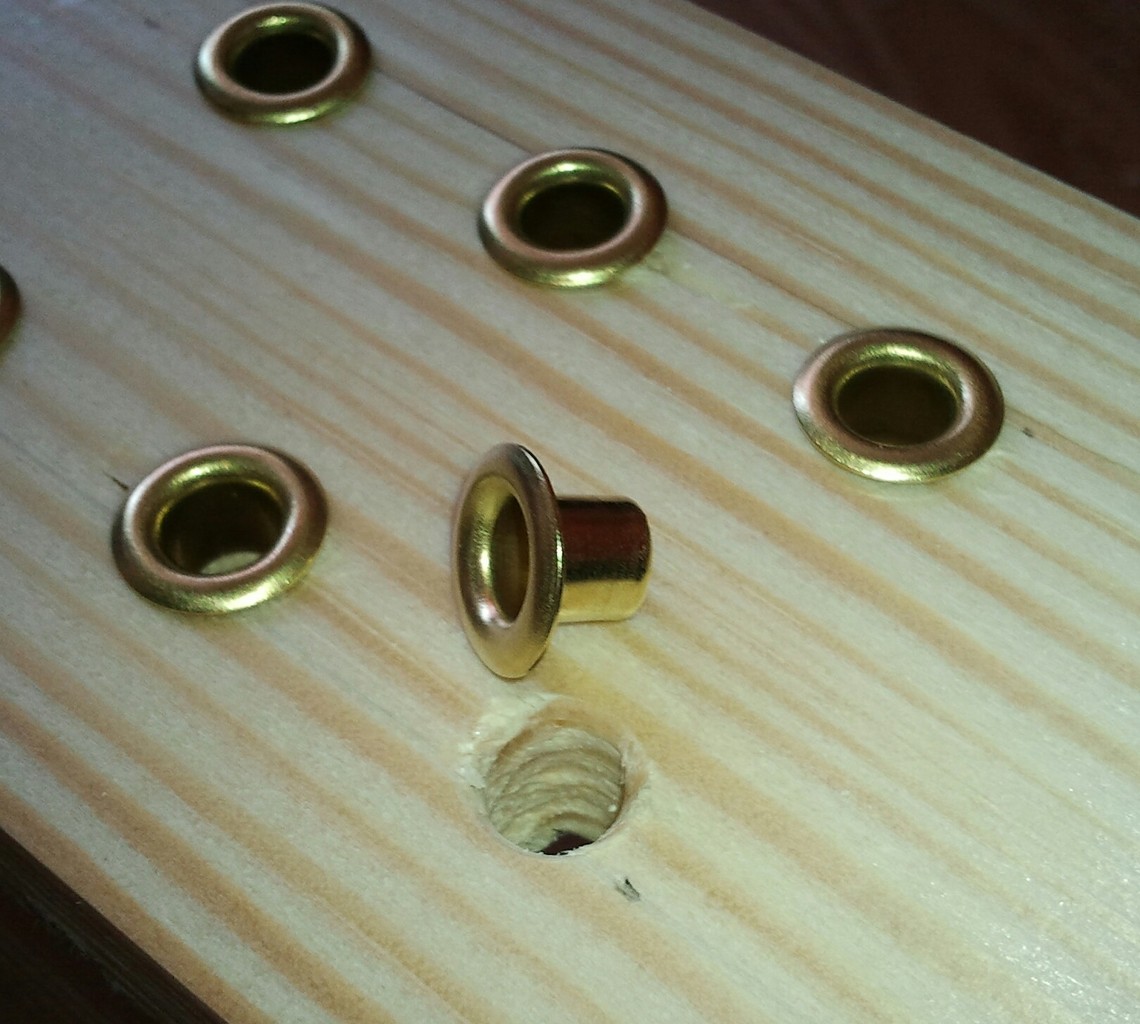 A szellőzőfuratokon, mint írtam réz ponyvaszegecsek vannak (talán nem ez a hivatalos nevük). Ezeken megy keresztül a madzag, amivel leszorítják a ponyvát. Barkácsboltokban van sokféle méretben és anyagból. A tekerőgomb már régóta a fiók mélyén lapult, de valamelyik elektronikai boltból való, nem emlékszem már.