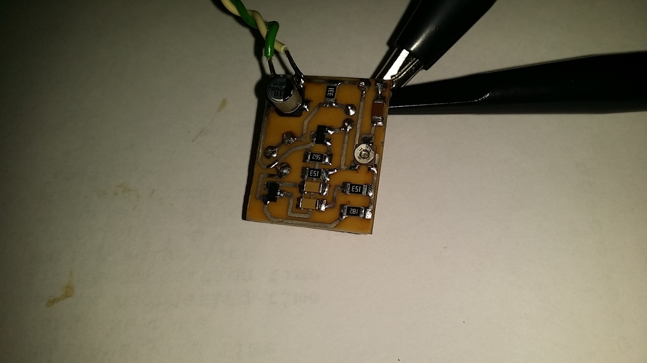 Készült egy Wien-hidas oszcillátor. Diszkrét elemekből épül fel, egy izzó biztosítja a stabilitást. A hatalmas nyákra (25x20mm) felépített áramkör hibátlan 1kHz-es színuszjelet produkál. A projektnek több célja is volt, egyrészt fióksöprés, másrészt gyakoroltam az SMD forrasztást, harmadrészt, előtanulmány egy készülő oszcillátoros cikkhez.