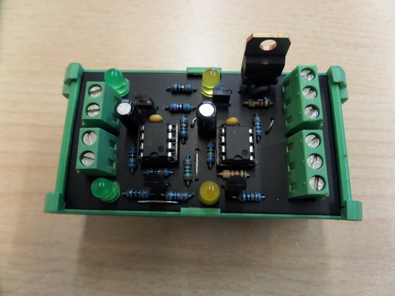 Sziasztok, most egy egyszerű áramkört építettem. Egy mini plc mellé. (Nem tudom mindeki tudja-e mi az a mini plc. Vannak akik szerint túlzás ezeket a kis programozható reléket plc-nek csúfolni, de szerintem nagyon praktikus eszközök, egy kis logikával viszonylag komoly vezérlések megvalósíthatók velük. Dolgozok Siemens S7 300-sal is, amivel azért nem lehet megismerkedni pár nap alatt, azt nagyon-nagyon sokat kel gyakorolni. Többek közt használtam már APB, Möller, és Siemesn Logo minit plc-t, ajánlom mindenkinek ezeket!) Az áramkör egy kétcsatornás jel hosszabbító ami a gyors jel változás miatt szükséges, nem áll fent elég ideig a magas szintű jel ahhoz, hogy a plc detektálni tudja. A nyák egy kalapsínre pattintható nyák tartóban kapott helye, 10 sorkapocs azért van, mert a két érzékelő innen kapja a tápot is. + - In1, + - In2, + -, Out1, Out2.