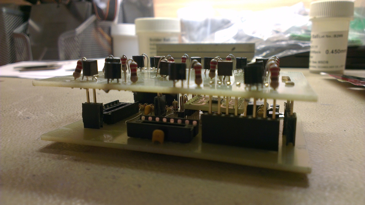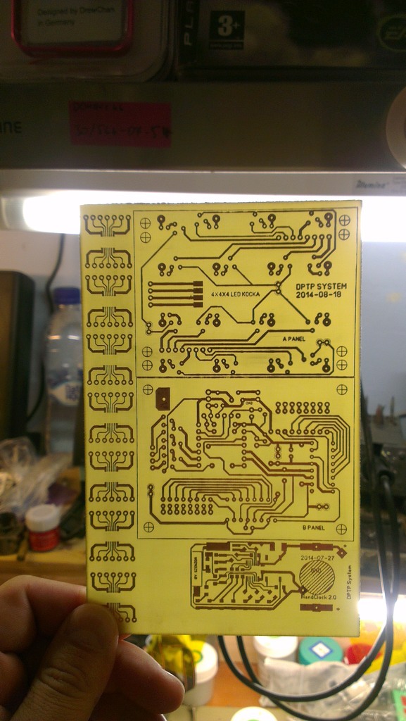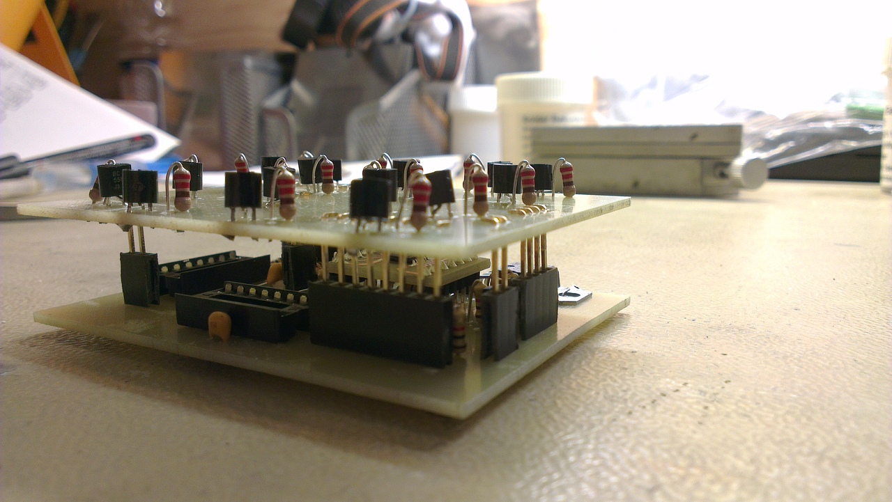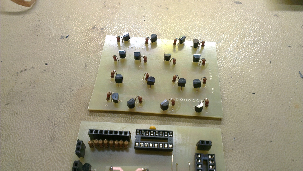 A LED-ek.. Hát igen. Ez a gyenge pontja. Ugyan sablont készítettem a távolságok tartása miatt, de a sorok egymásba forrasztásakor sokat szenvedtem, hogy megtartsam a távolságokat és az egyenességeket, mind függő mind vízszintes irányba. Az egyetlen szerencse, hogy ezt még most is lehet óvatosan pozicionálgatni, szóval még finomítok az állásukon. |