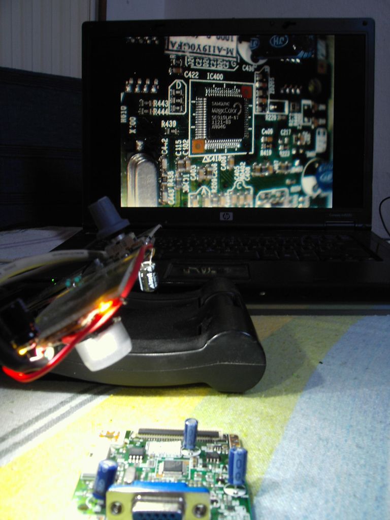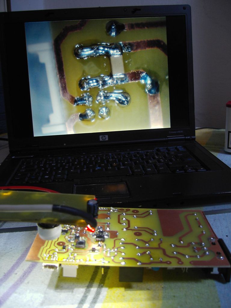 Rögtönzött IC beültető, ellenőrző kamera. Eredetileg azért készült, hogy IC csere közben, amikor füstöl a flux a pofámba, lássam, hogy mikor van helyén az IC, de annyira jól sikerült, hogy forrasztások ellenőrzésénél is megálja a helyét. Egy 3000Ft-os EMTEC webkamerát bontottam szét és meglepődtem, hogy a gyári optikával 1.5cm-től, vagy 10 méterig lehet álítani a fókuszpontot, ráadásul 1280x1024-es felbontást is tud 5FPS mellett, így elég hasznos szerkezetnek bizonyult, még azt is látom vele, amit nagyítóval sem.