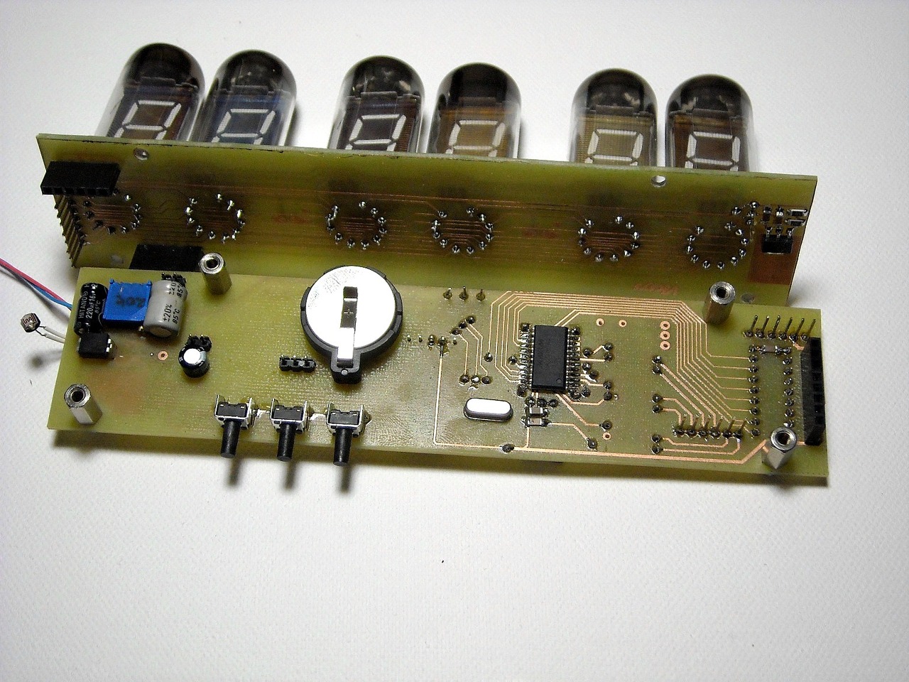 Nem, dehogy is! Miért unnám? Minden egyes darab fejlettebb az elődjénél, mindig szebb vagy jobb az újabb példány. Mindegyikkel tanulok valamit (szoftver és hardver is). Ez egy kihívás volt, mert saját anódfesz generátort tartalmaz, a PIC programja csupán 4%-ot foglal el a teljes kapacitásból. Tudja a nagyon pontos dátum/idő/belső hőmérsékletet és fogadja a DCF jelét, arról képes szinkronizálni. A csövek alatt RGB ledek vannak (amiket valószínűleg tényleg nem kéne eröltetni, mert nekem sem tetszik). Nyomógombokkal beállítható és hála a gondos tervezésnek a 2 panel olyan közel van egymáshoz, hogy könnyen beépíthető egy nagyon alacsony dobozkába. Ezen kívül jó pár extrát tud még: természetesen van villogó elválasztó a csövek között (a panelon látszik a kialakítás, csak még vacillálok, hogy oda is cső kerüljön vagy ledek), visszajelez, hogy az elmúlt órában volt-e sikeres DCF szinkronizáció? Aztán van bekapcsolási üdvözlő szöveg és egészkor ill. félkor ki-be úszó animációval vált az óra és dátum között. A jelenlegi példány tudja fényerőszabályzást, de azt is kiveszem belőle és beállítok egy kellemes közepes fényerőt mert nekem speciel nem tetszik. A jelenlegi terv azért született, mert szerettem volna egy nagyon alacsony példányt.
