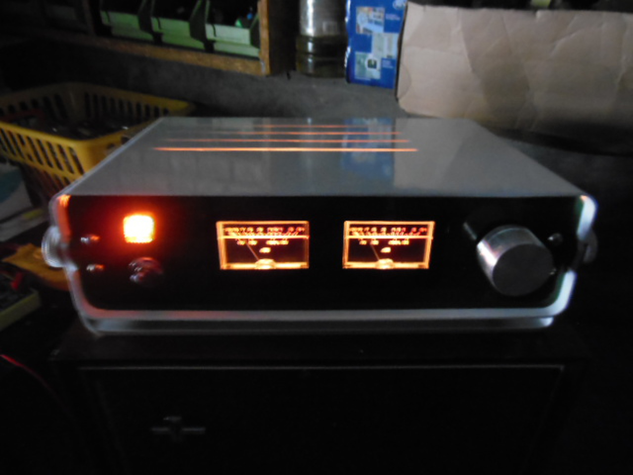 Aranyos ez a kis erősítő, és tetszetős is. Gratulálok hozzá. Ha megengedsz egy apró megjegyzést, szerintem jobban nézne ki olyan szürke előlappal mint az oldala, vagy feketével, mint a műszer kerete. De ha direkt választottad a zöld színt, mert Neked az tetszett, akkor nem szóltam.
