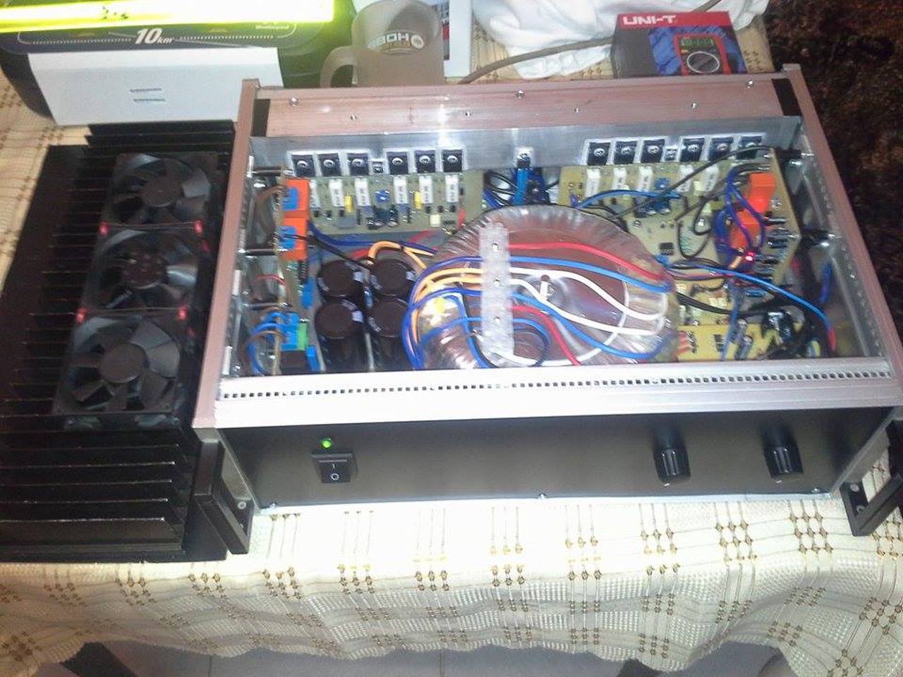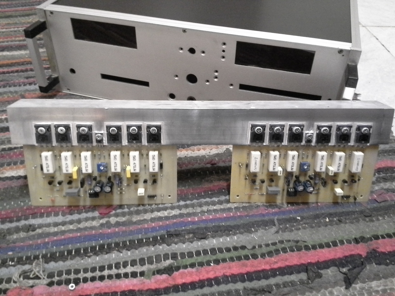 Az "L" profilban 4 menet található azokon keresztül csatlakozik a M4-es csavarokkal hűtőborda az erősítő tetejére. A Doboz oldalán nem fértek volna el ilyen méretű bordák, illetve hátul meg a csatlakozók miatt nem volt lehetőség elhelyezni jelenleg csak a képen látható hűtőbordát tudtam beszerezni, viszont ez nem elegendő felület teljes kivezérlés esetén, és az esztétikán is ront valamennyire, bár ez szubjektív. Ezért most azon vagyok hogy az egész doboz tető egy hűtőborda legyen, csak sajnos igen nehéz ilyen méretben szerezni. Szóval ezzel lesz még egy kis munkám, a teljesen kész erősítőnél már az egész tető egy borda lesz, és mini ventilátorok fogják kifújni a levegőt.