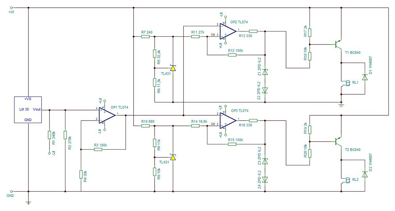 Építettem egy 2x450W-os erősítőt, Monster Végfokokból. Az erősítő fő egységei: -Két MONSTER, MOSFET párokkal felépített sztereo teljesítményerősítő (450W/4 ohm) -1500VA toroid transzformátor + szűrt tápegység (+-70V ill. 90V) -Aktív, műveleti erősítős alul áteresztő szűrő -Kis teljesítményű középmegcsapolásos transzformátor + stabilizált szimmetrikus tápegység (+/-12V). -A védelmi+hangfrekvenciás áramkörök táplálására. -Sztereó Koppanásgátló + egyenáram védelem -Komparátoros hővédelem (saját tervezés) -Hidaló áramkör (Az erősítőt hídba kötve is használhatjuk) -Lágyindító a toroidnak Az erősítőt legtöbb áramkörét az oldalon is megtalálható kapcsolásokból építettem, MCU nélkül teljesen analóg rendszer, egy 1500W-os toroid transzformátort készítettem hozzá, szekunderenként két feszültséggel, (így kis változtatással máris 8 ohm-on használhatom), ennek megfelelően méreteztem a Pufferkondikat is. Célom egy stabil nagy teljesítményű erősítő építése volt, mely több funkciót is lelát: Egyrészt használhatom normál sztereó erősítőnek, másrészt meg egy hidalt sub erősítőnek. Ebből következően elhelyezésre került egy műv erősítős alul áteresztő szűrő, illetve egy sima műv erősítős fázisfordítás, és így a sub szűrő után a jel megjelenik normál és ellenfázisban is ezek kapcsolódnak az erősítő bemenetére, így dupla terhelő impedancia esetén 800W-ot letudok venni róla. A két mód között egy egyszerű két áramkörös 2 állású kapcsolóval válthatok, a Speakon csatlakozók pedig lehetővé teszik hogy bármelyikről levehető a hidalt jel. az erősítő panelok közös 4 mm-es alu profilra lettek szerelve, a közös hőmérséklet figyelés érdekében, amit egy TO220-as tokozású LM35-ös szenzor végez a jó termikus kapcsolat érdekében. A hővédelmet úgy gondoltam hogy saját magam tervezem meg, egyrészt mert szeretek fejleszteni, másrészt pedig az Országos Elektronikai Konstrukciós Versenyen indultam az erősítővel, és úgy gondoltam előnyt jelent egy saját tervezésű áramkör. Lényegi működése hogy 55°C foknál bekapcsol egy ventilátort, majd némi hiszterézissel kikapcsolj, konkrétan ha 35°C alá csökken a hőmérséklet. aztán ha a hőmegfutás miatt eléri a 90 Fokot abban az esetben vészleállítás a toroidnak, majd ha a ventilátor lehűti 60°C alá a akkor visszakapcsolja az erősítőt. Ezt a problémát két nem invertáló bemenet felől vezérelt referencia feszültséges hiszterézises komparátorral oldottam meg. A komparátoroknak tl074-et használtam meg egy zénerekből felépítette bipoláris vágó áramkört (ugyanis a telítésbe vitt kimenete a tl074 műv erősítőjének TINA szerint szimmetrikus 12V esetén 10,5V de amit mértem ott 11V is volt, és mivel nem tesztelgettem próbapanelen, így nem bíztam a dolgot a szerencsére egyértelművé tettem a kimeneti feszt hogy pontosan kitudjam számolni a hiszterézist) A hőszenzor be lett lőve a teljes hőtartományra, a kimeneti jele 10 szeres erősítést kapott (azért hogy tápfeszültséggel összemérhető tartományba legyen a fesz a komparátorok számára, szintén tl074 egyik erősítőjével), az erősített jelet megkapta mindkét komparátor, a pozitív visszacsatoló ellenállást 100K-ra választottam és így maradt egy ismeretlen ellenállás és egy ismeretlen referencia feszültség komparátoronként, ezeket kiszámoltam, majd a referenciákat TL431-el előállítottam. igyekeztem optimalizálni a szabványsorból az értékeket így elég jó pontosságot értem el, majd a komparátorok kimenetén megjelenő jellel kapcsolgattam a reléket az invertálás miatt pnp tranyókkal hajtottam meg a reléket. csatolom róla a kapcsolási rajzot illetve képeket az erősítő építési folyamatáról illetve a kész erősítőről. A dobozolást egy alu rack-be oldottam meg elég praktikus sínek vannak benne így modulárisan lehetett építgetni, fekete fóliával bevontam minden oldalát, illetve a szükséges elő és hátlapot CNC-sekkel kimarattattam megfelelőre. Egyébként a tegnap és tegnap előtt lezajlott Országos Elektronikai Konstrukciós versenyen elég jó helyezést értem el a pályaművel, 2. lettem. A hozzászólás módosítva: Ápr 20, 2015