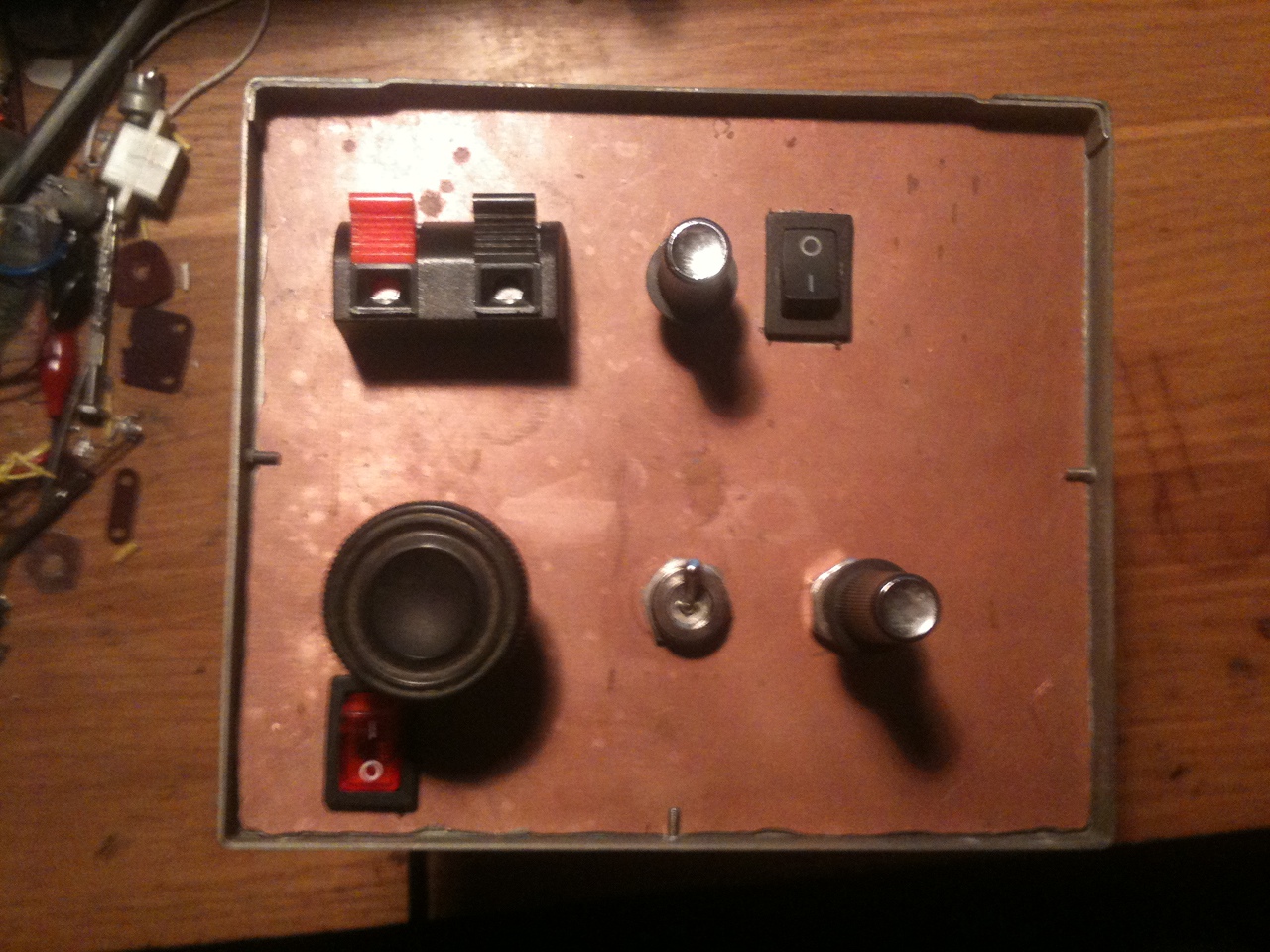 Mindigis szerettem volna valamit beleépíteni egy öreg VL 100 -as TV házába ,hát megadatott rá a lehetőség. A szerelés magáért beszél,tartalmazza a felület szerelés minden fortélyát,a miniplex bármilyen területű felhasználásának legalább 90%-át, egy kis 1 oldalas ültetett szerelést,és persze a hálózati feszültségű kettős szigetelésű szerelést (a hálózati kapcsolónál kivéve).