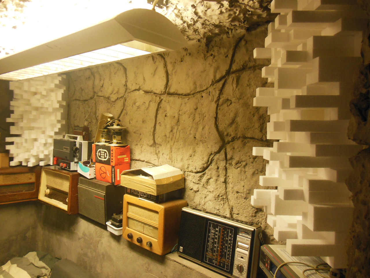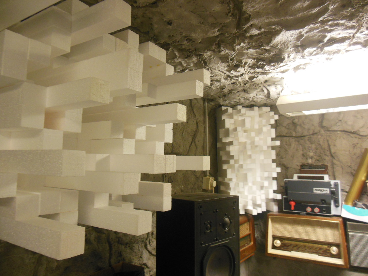 Az egész pince két darab 2,5m*2,5m helyiségből áll. Ez a belső része. Ennek a négy sarkát látod. A másik helyiség oldalán van a lépcső. A két szoba összekötő"ajtaja felé néz a hangsugárzó. A lépcső falára szeretnék még ilyeneket. (A kép lopott, avxről van.)