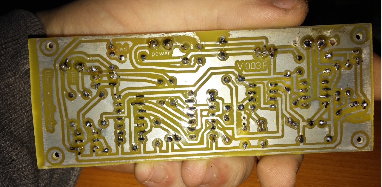 Mostanában nagyon "rá vagyok állva" a diszkós cuccokra. Egy diszkó fényt építek aminek meg van az első eleme ami egy hang vezérelt motor.Tökéletesen működik. A NYÁKot vasalással készítettem, a két szélen lett egy kis hiba amit filcel orvosoltam, ezen kívűl a NYÁK szerintem tökéletes. Ez az első "nagyobb" projektem. Tippeket és építő kritikát szívesen fogadok.A forrasztásomon még kicsit javítani kell. Ha van valakinek valami jó kapcsolása maga a fény részéhez az PÜben legyen szíves megosztani velem ha publikus! Köszönöm!