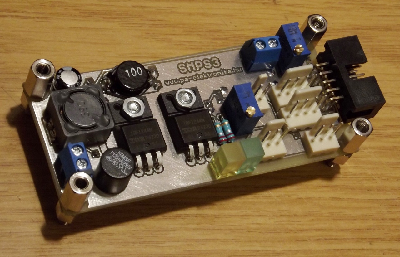 Ez itt egy 0-45V és 0-2,5A-es labortápegység lesz. Tisztán kapcsolóüzemű (szinkron step-down), nincs külön előszabályozója. Ezért tud viszonylag egyszerű és kicsi lenni. A képeken már a második prototípus látható, az elsőről nincs fényképem de az szinte majdhogynem tökéletesen működött. Pár hónapja belefogtam egy ehhez hasonló kis teljesítményű SMPS labortáp fejlesztésébe (Bővebben: Link), de akkor az sajnos zátonyra futott az akkor használt step-down IC hülyeségei miatt. Ebben már nincs ilyen probléma. Készül hozzá párhuzamosan egy PIC-es vezérlőmodul is, ez a nyák szélén lévő szalagkábel-csatin kapcsolódik rá a kis tápra. Ha a labortápocska jól teljesít, akkor készül majd belőle 50V/10A-es verzió is.