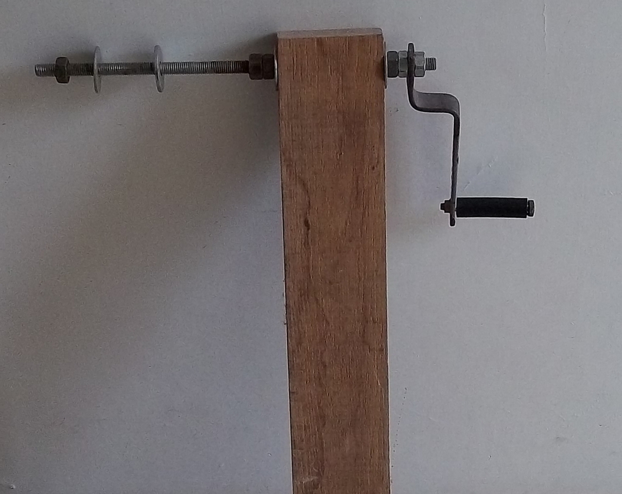 Egy darab tölgyfa deszka, egy 10-es csavar meg a végén a hajtókar, és az egész befogva a satuba. De ahhoz készült céldarabbal (ami egy gyalult deszkadarab meg néhány tipli) tekertem meg a fémdetektor nagy átmérőjű kereső tekercsét is, szintén ezzel a szerkezettel.