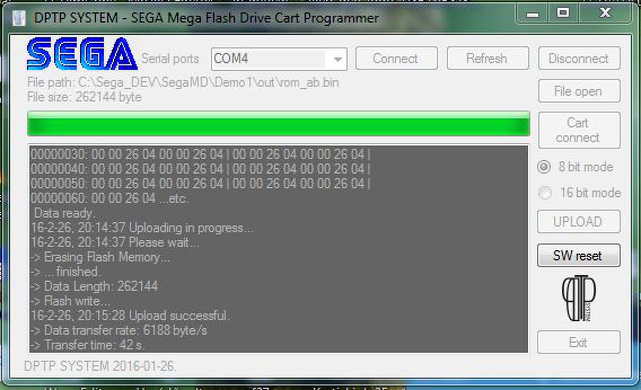A projektem lényege az, hogy amit SEGA MEGA DRIVE gépre fejlesztek demó programot, ki tudjam próbálni illetve az ilyen jellegű rendezvényekre az elkészült demó programokat ki lehessen vinni és azokat eredeti hardverben futtatni. Ezen felül alkalmas az eszköz eredeti játékok betöltésére és azokkal lehet játszani, ez azért jó mert vannak olyan ritka és drága játékok amelyek beszerzése mára már alig vagy nem is lehetséges. Mivel mindig is nagy SEGA MD rajongó voltam, így ez a projekt jóérzéssel és örömmel töltött el mindvégig. (persze néha rágtam a kefét )Pár adat: A kazi, UART-on keresztül kommunikál egy direkt erre a célra megírt PC-és programmal amelyet szintén én írtam. 2 üzemmódot támogat, az egyik a 8bit-es a másik pedig a 16bit-es üzemmód. Sega játékoknál van értelme, de nem fejtem most ki mi is az. Sikerült a feltöltési sebességet is radikálisan emelni (sok segítséget kaptam, amit köszönök), így egy 8Mbit-es vagy is egy 1MB-os fájlt kevesebb mint 3 perc alatt képes feltölteni a memóriába. Azt hiszem, ha emelném 64bájt-ról 128bájt-ra az adatbuffert, akkor még esélyes lenne emelni a sebességet, de ezzel én már megelégszek és ráérősen lehet majd csiszolgatni a dolgot ![]() Egy videó összeállítás a működéséről: DPTP System - DPTP Sega Mega Flash Cart Ez a projekt igényelte eddig a legtöbb türelmet és energiát tőlem, és még persze nincs teljesen kész. Készül a letisztult és átkötés mentes nyákterv is ami, ha minden jól megy talán egy-két hónap múlva már meg is lesz. Köszönöm, türelmüket és segítségüket: Hp41C, kissi, nedudgi, killbill, sdrlab, benjami, és mindenkitől aki még segített.