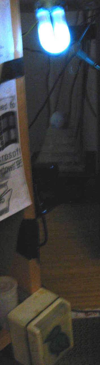 Készítettem egy újrahasznosított lámpát egy vacak kínai "U" fénycsöves éjjeli fényből és egy kék PC-fénycső transzverteréből. A fénycső lábait ragasztópisztollyal szigeteltem, valamint szintén azzal rögzítettem a tanszvertert a PC asztalom tetejére. A kapcsoló egy újrahasznosított 220V kültéri villanykapcsoló, de csak 12V-ot kapcsol, melyet egy dugasztáp szolgáltat az asztal alatt.