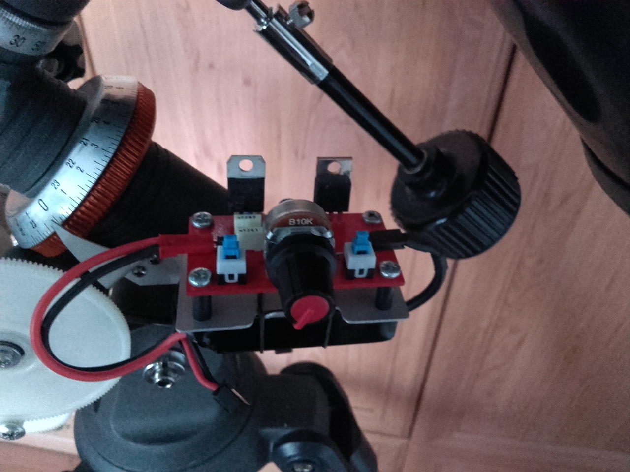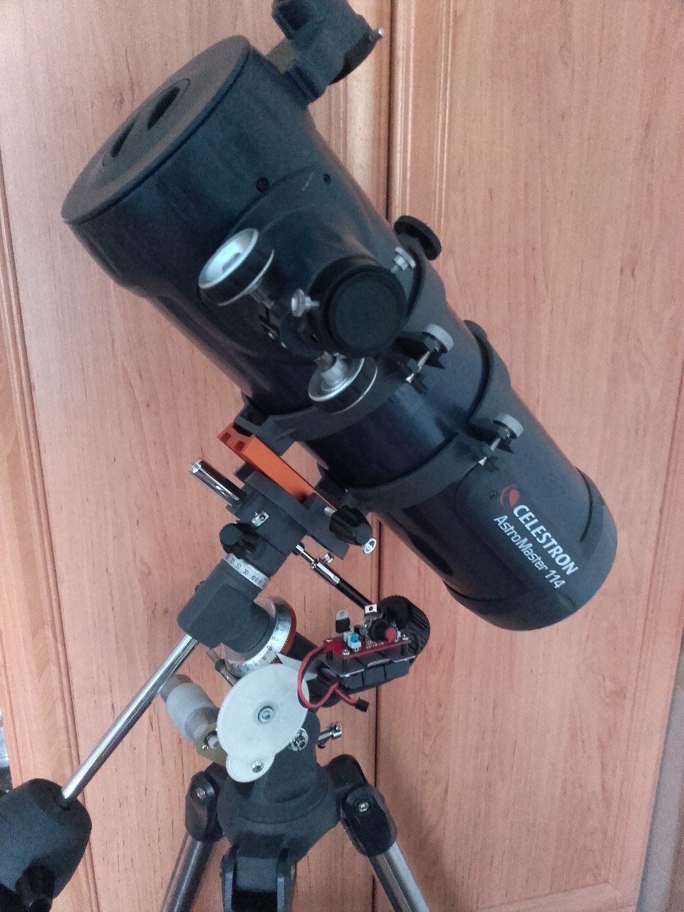 Készült egy csillagkövető óragép Astromaster távcsőhöz. Itt az elektronika volt a kisebb kihívás, inkább a mechanika és az áttétel okozta a nagyobb fejtörést. Csillag, vagy bolygómegfigyelés alkalmával a Föld forgása, illetve a megfigyelt objektum mozgása miatt az folyamatosan "kimászik" a látómezőből. Kézzel utána lehet természetesen állítani, de hiába a stabil állvány, minden egyes érintésre, akármilyen finoman is tesszük, beremeg a kép. Ezzel a szerkezettel viszont kompenzálható ez a mozgás, így a megfigyelt objektum mindig a látómezőben marad. Nagyon előnyös tud lenni, amikor több ember szeretne belenézni a távcsőbe, vagy pl. okulár és szűrőcserénél nem kell újból keresgetni a megfigyelni kívánt objektumot. Az elektronika egy szimpla PWM-generátor 555-ös timert használva. Van egy kapcsoló a bekapcsoláshoz, egy a forgásirány váltáshoz, és egy potméter a fordulatszámhoz. A tápellátást egy 7,4V/500mAh-s lipo biztosítja.