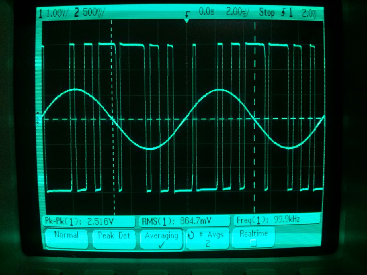Az első két fotó a vivőfreki, 30 Vpp, (minden képen tizes osztóval, a kimeneti jelalakok osztó nélküliek). A 3-6 kép a kimeneti jelalak és a pwm jel együtt. Az utolsó előtti kép a kimeneti DC szint "elmászkálása" (200 sec). Az utolsó kép a vivőmaradék a kimeneten. A valóságban ennél kisebb kell legyen, a szkóp mérőkábele összeszedi a zavarjelet, ha a testhez érintem a mérőcsúcsot szinte ugyanezt látom.