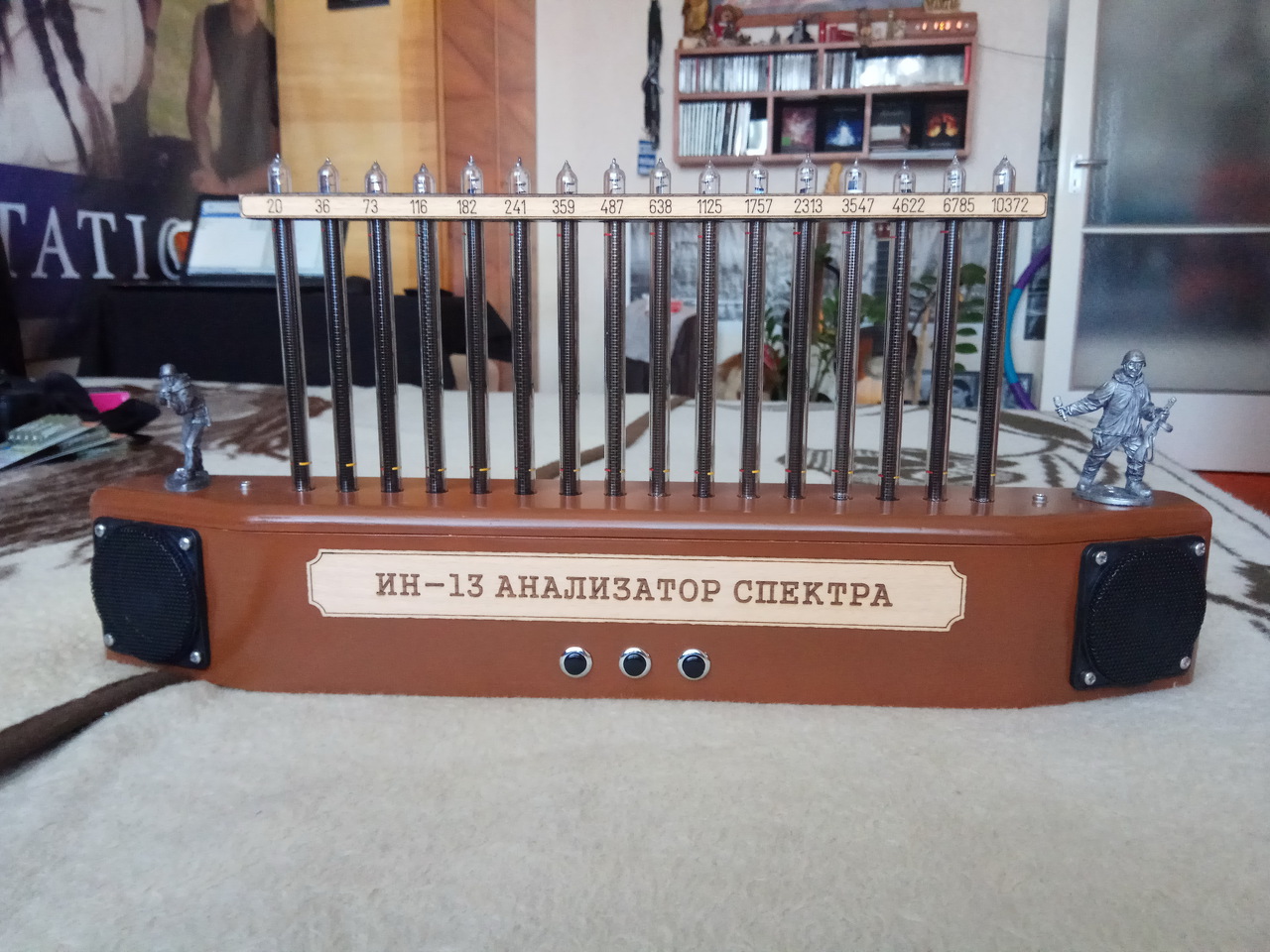 Jobb oldalon a sok éve készült nixie órám, illetve a hétvégén elkészült nixie audio spektrum-analizátor a következő funkciókkal: