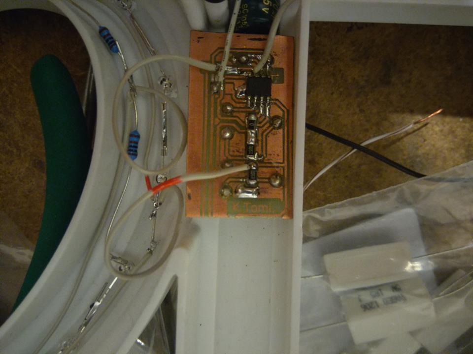 ![]() Készítettem aszonyságomnak egy egyszerű képkeretből egy villogó képkeretet. Odáig volt érte, azt hiszem. ![]() Az első verziót 12V-os 1x23A-s méretű gombelemmel képzeltem el, de az már egy hét alatt lemerült, csak a nyugalmi áramfelvételtől, ami 50uA, azaz 0.05 miliamper. Ezután következett 180mA-es 2db 3,6V-os gombelem, aminek sajnos már külön doboz kellett, de az is csak 2-3 hetet bírt, mert egyrészt sokszor villogott, ami igaz pár másodpercig tartott, és 10mA-t fogyasztott ez alatt. Matematikailag elég lett volna a 180mA, de évek múlva vesztett volna az elem az élettartamából, ráadásul nem sikerült megoldani a normális töltést USB-ről, 2 db sorba kapcsolt akkuval. Most jön majd 2db soros 1000mA körüli cella, egy 12V-os töltő áramkörrel, aminek az 5V-ból állít elő egy microchip alkatrész(MCP1650) energiát. Ha 200mA-es erősségű 12V-hoz az 5V-ból 400mA-t vesz fel a step-up, akkor már jó vagyok. (mertha jól tudom a számítógép USB tápja max 500mA-es.)A saját 555-ös villogtató kapcsolást vezérlő PIR mozgásérzékelő hestore-ból való, a gomb akkuk pedig a conradból.