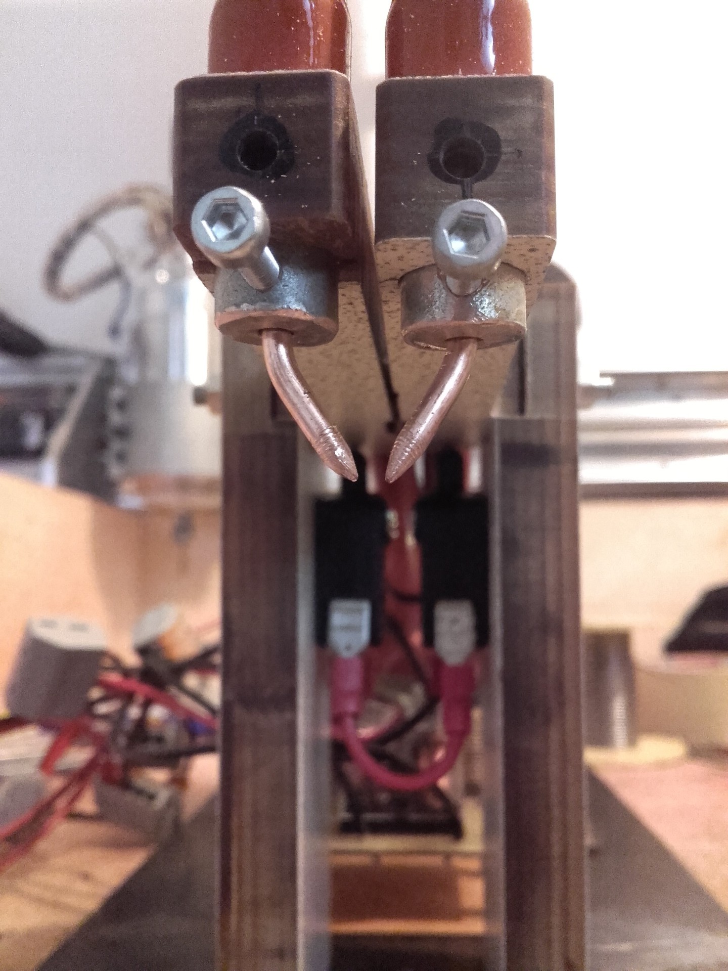 Sziasztok! Nemrég feladtam egy hirdetést 18650-es akkupakk készítésére. Kaptam elérhetőséget, és a neten is találtam ezzel foglalkozó céget, viszont olyan árakat adtak, amit magasnak gondoltam, így belefogtam egy saját ponthegesztő építésébe. Még korábban félretettem hasonló célra egy mikrótrafót, így "csak" az elektronikát, és a mechanikát kellett kifejleszteni hozzá. A mechanika tulajdonképpen a piaci modellekre hasonlít. Két külön mozgó kar van, mindegyiken 1-1 mikrokapcsoló, amelyek sorba vannak kötve. Az áramkör egy 2 relés, kondenzátoros időzítéses megoldás. Már az első hegesztésnél látszott, hogy sikerült eltalálni az impulzus hosszát. Képeken látható az első néhány hegesztés. Tudom, a kábelezés nem tökéletes, de ez még csak kísérleti darab. Majd összerakom rendesen is.