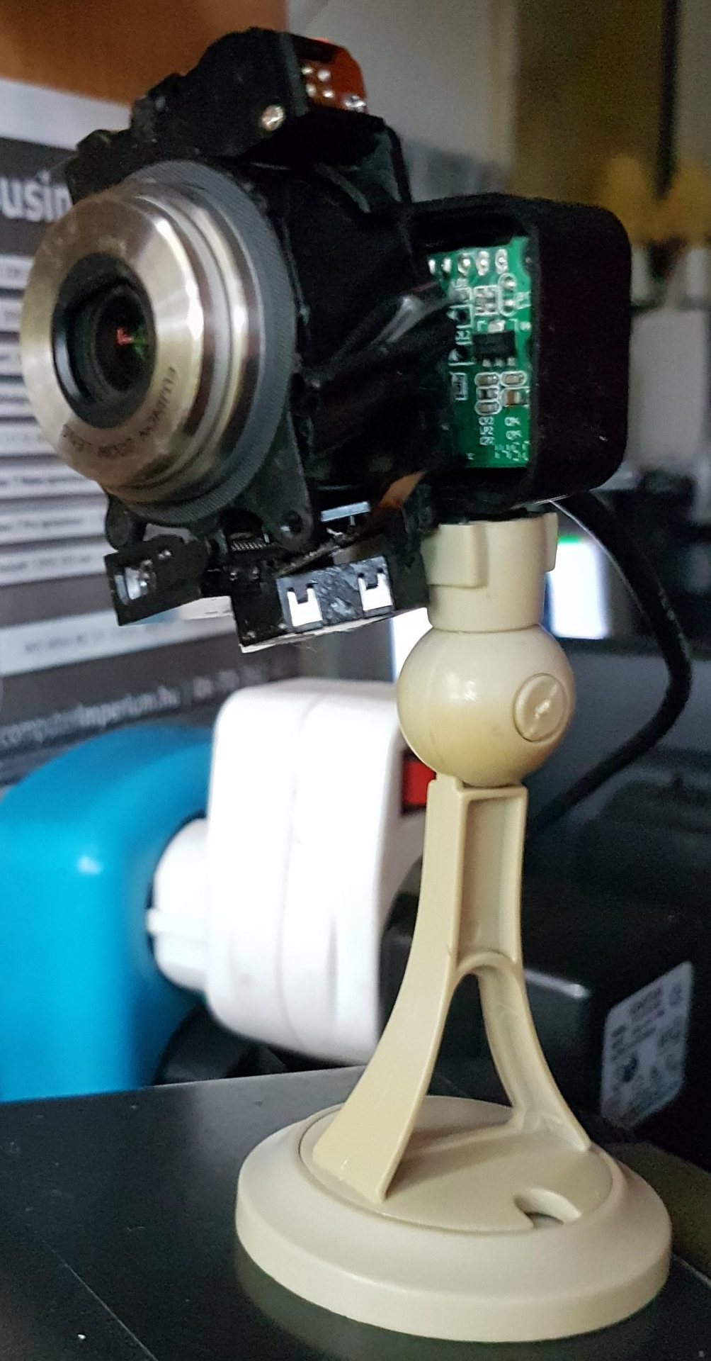 Hogy mi ez? Egy olcsó USB webkamera egy döglött fényképező optikájával és egy megfigyelő kamera talpával! Az optikából el lett távolítva a mozgató motor és a mechanikába bejuttattam némi szigetelő szalagot hogy ne állítódjon el magától az optika. Zoom nincs, helyette a "zoomot" kézzel tekergetve lehet közelebbre/távolabbra fókuszálni (enyhe fix zoomoltsággal rendelkezik). A hozzászólás módosítva: Okt 14, 2019