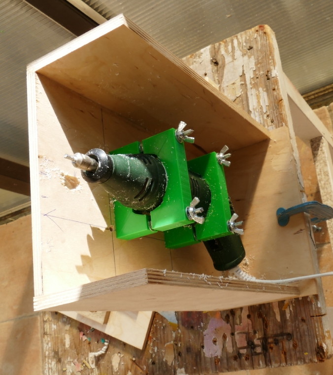 Van egy kézi kis marógépem de azt nem lehet megtartani pontosan. Ezért a marógép méretére nyomtattam két pár rögzítő elemet, amely merőlegesen tartja. A fedlap alján elcsúszás biztosító ütközök vannak és a lyuk ahol a marószár kibújik. Hőre lágyuló műanyag volt, ezért nagyon lassan és kihűlést megvárva folytattam a munkát. Leglassabb fordulaton. Ez az öt lyuk 25 percen belül megvolt. A hozzászólás módosítva: Okt 17, 2019